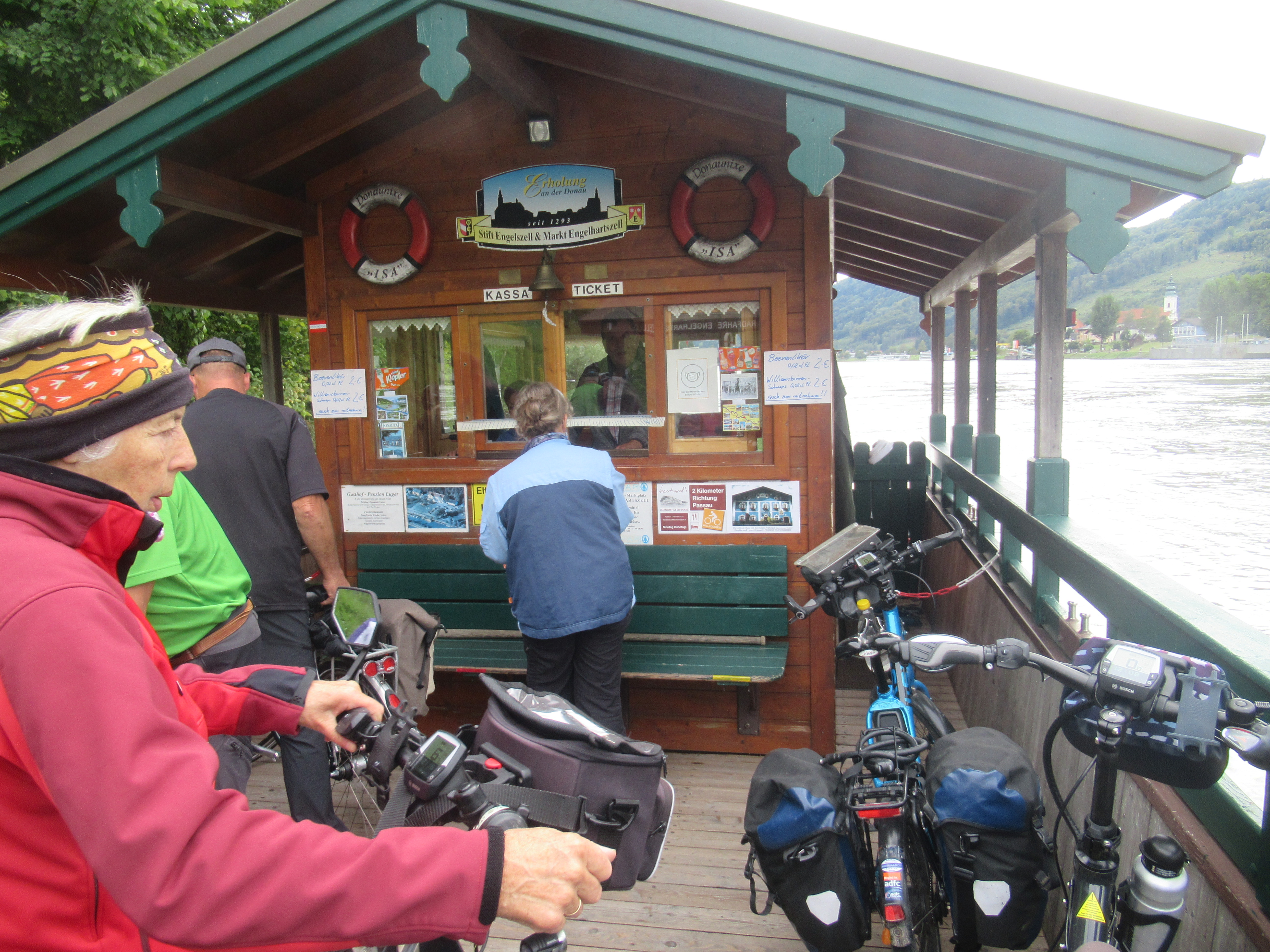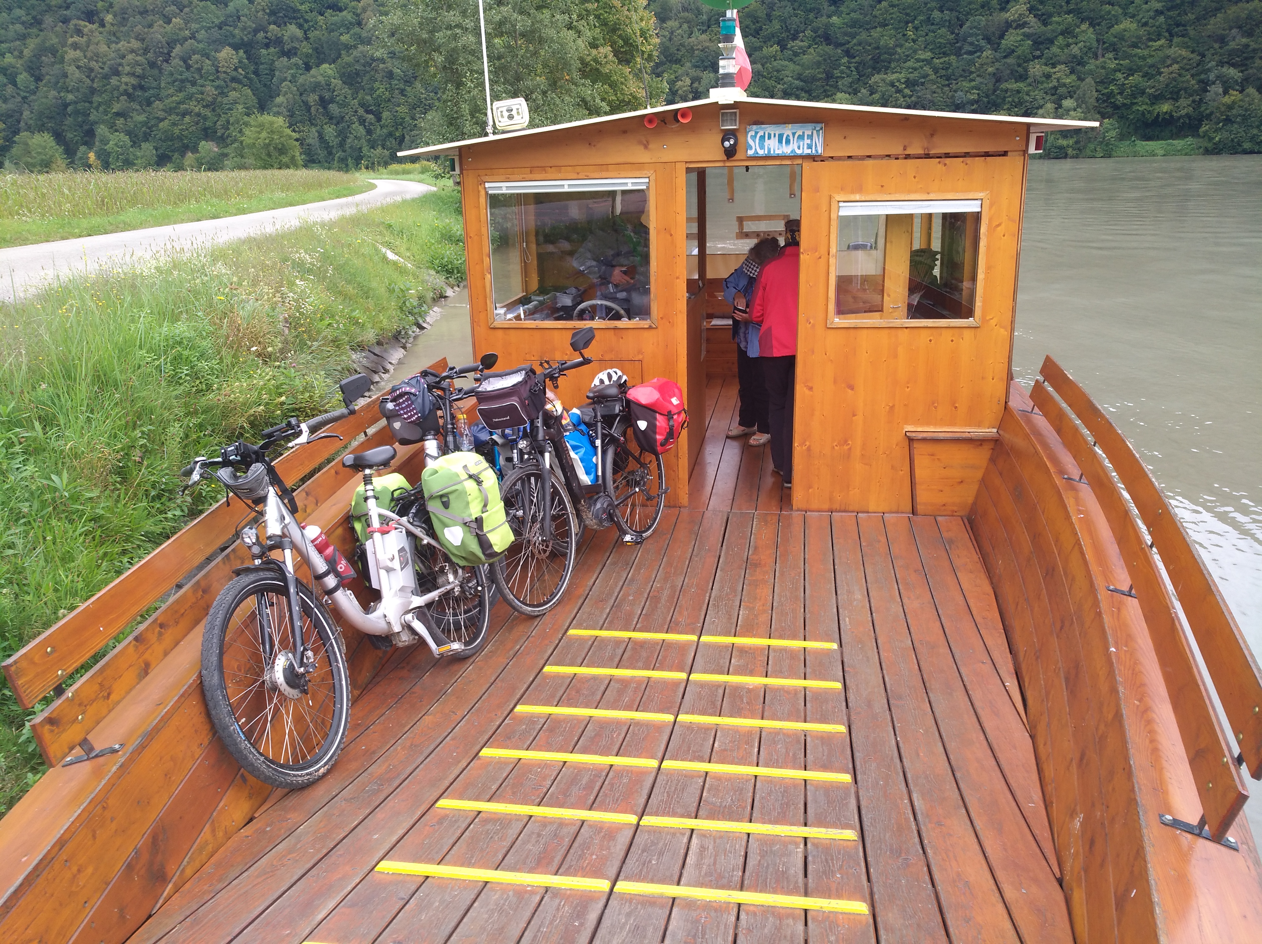 Wieder per Fähre zurück auf die linke Seite der Donau. Ein meditativer Weg und schon naht die Donauschlinge. Wir setzen über und können so wunderbar die Flussschleife sehen. Und schon sind wir in Haibach, Ortsteil Inzell, im Haus St. Nikolaus, wo wir heute übernachten. Der Service ist klasse, es gibt in der Fahrradgarage abschließbare Fächer mit je zwei Steckdosen zum Akkuladen!