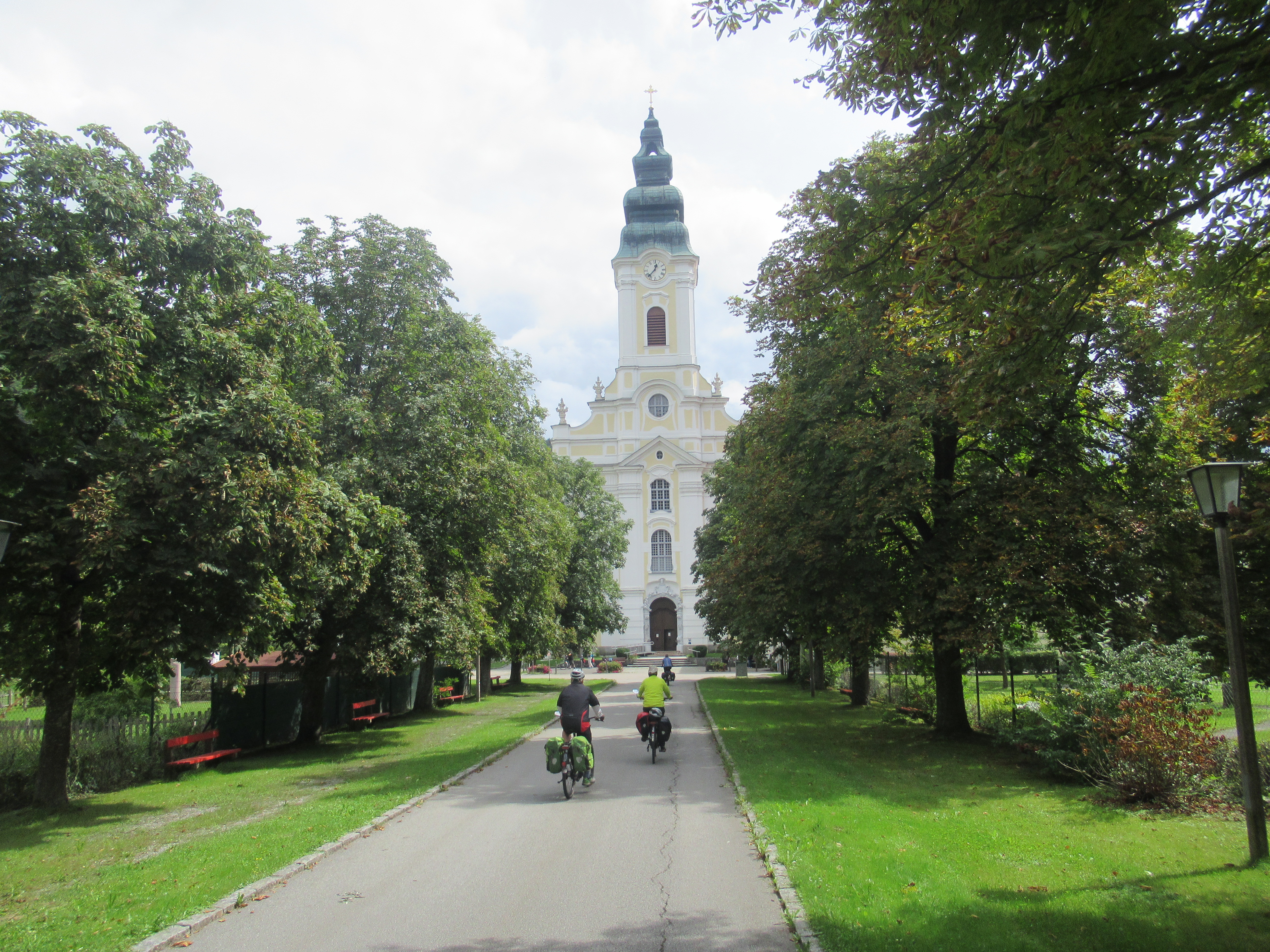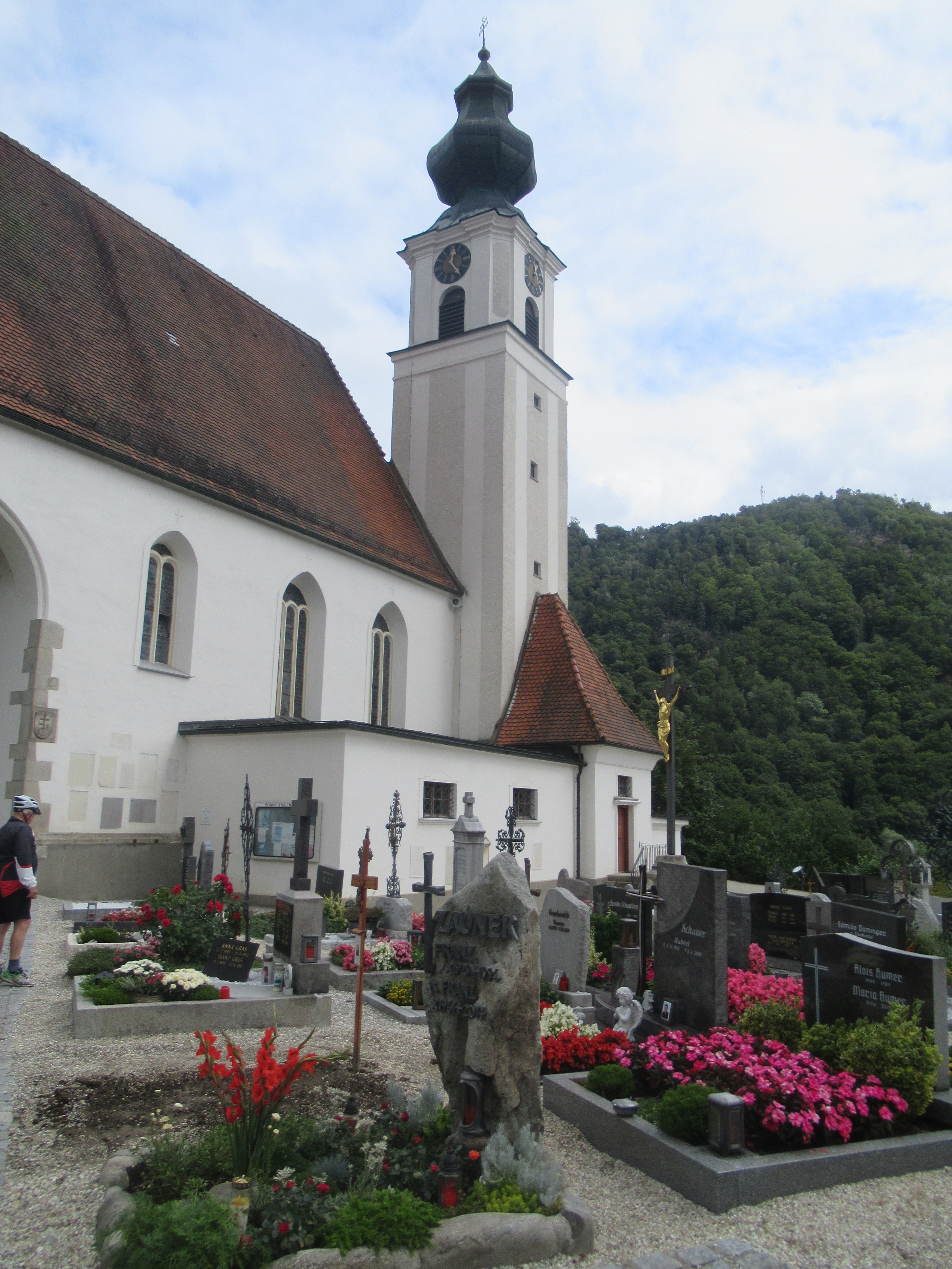 Weiter führt der Weg durch das Naturschutzgebiet Donauleiten bis zum Jochensteinfelsen, der als Sitz der Donaunixe Isa gilt, eine Schwester der Loreley. Mit der Radfähre setzen wir über nach Engelhartszell. Zunächst schauen wir uns die Gemeindekirche samt Friedhof an, danach die Klosterkirche. Gegründet als Zisterizenerkloster ist es heute das einzige Trapistenkloster Österreichs. Eine sehr barocke Kirche sehen wir, in den Seiten-Nischen Glassärge mit Skeletten längst Verstorbener in prächtigen, reich geschmückten Kleidern. Etwas makaber. Das Deckengemälde wurde im Stil des 20. Jahrhunderts neu gestaltet, nachdem das Gewölbe beschädigt und einsturzgefährdet war.