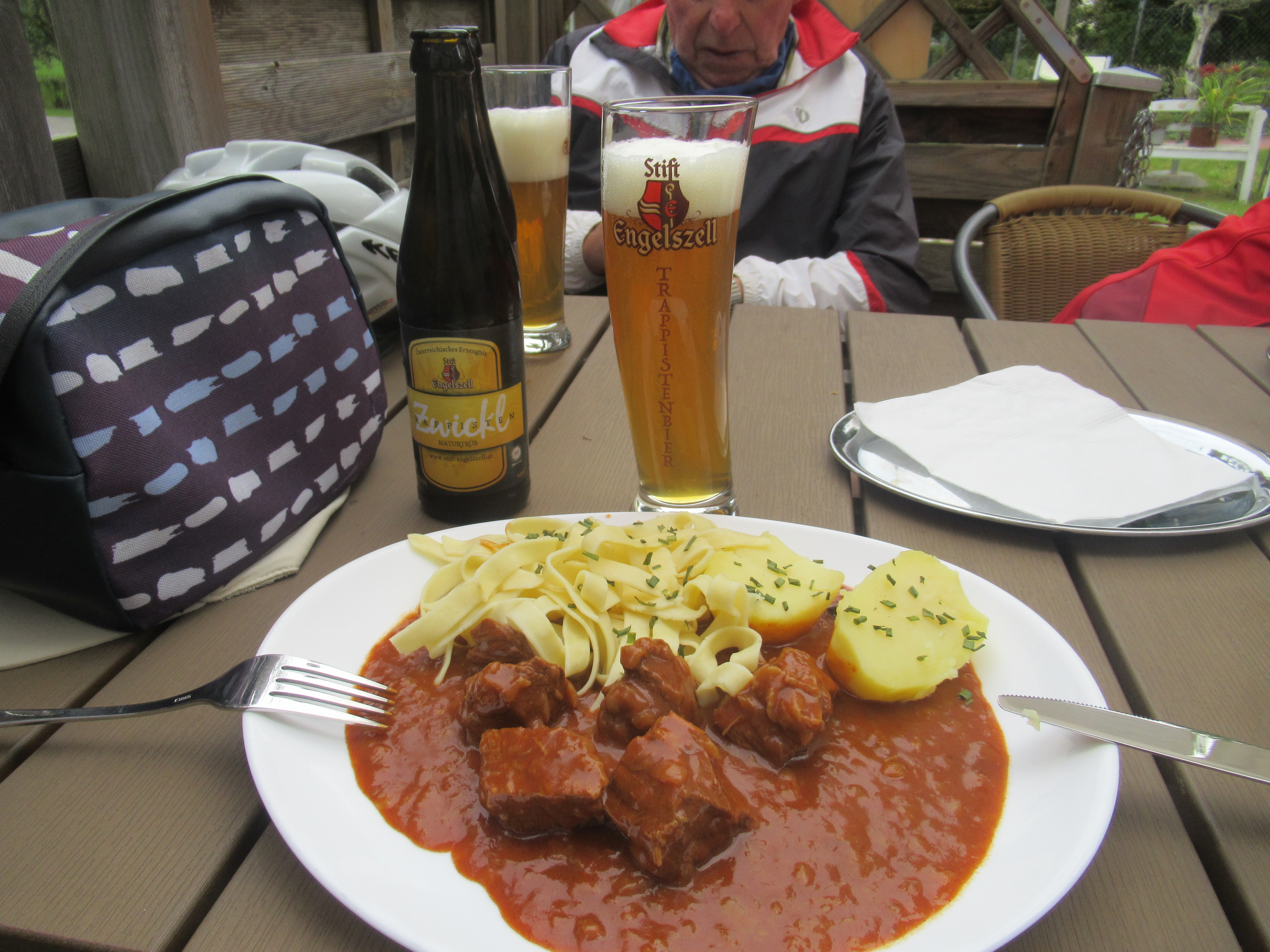 Unsere Pause steht heute unter österreichischen Speisen. Blutwurstgröstel, Winzerschnitte mit Speck, Wurst und Spiegelei und ein Mohnzelt aus Kartoffelteig, alles lecker!