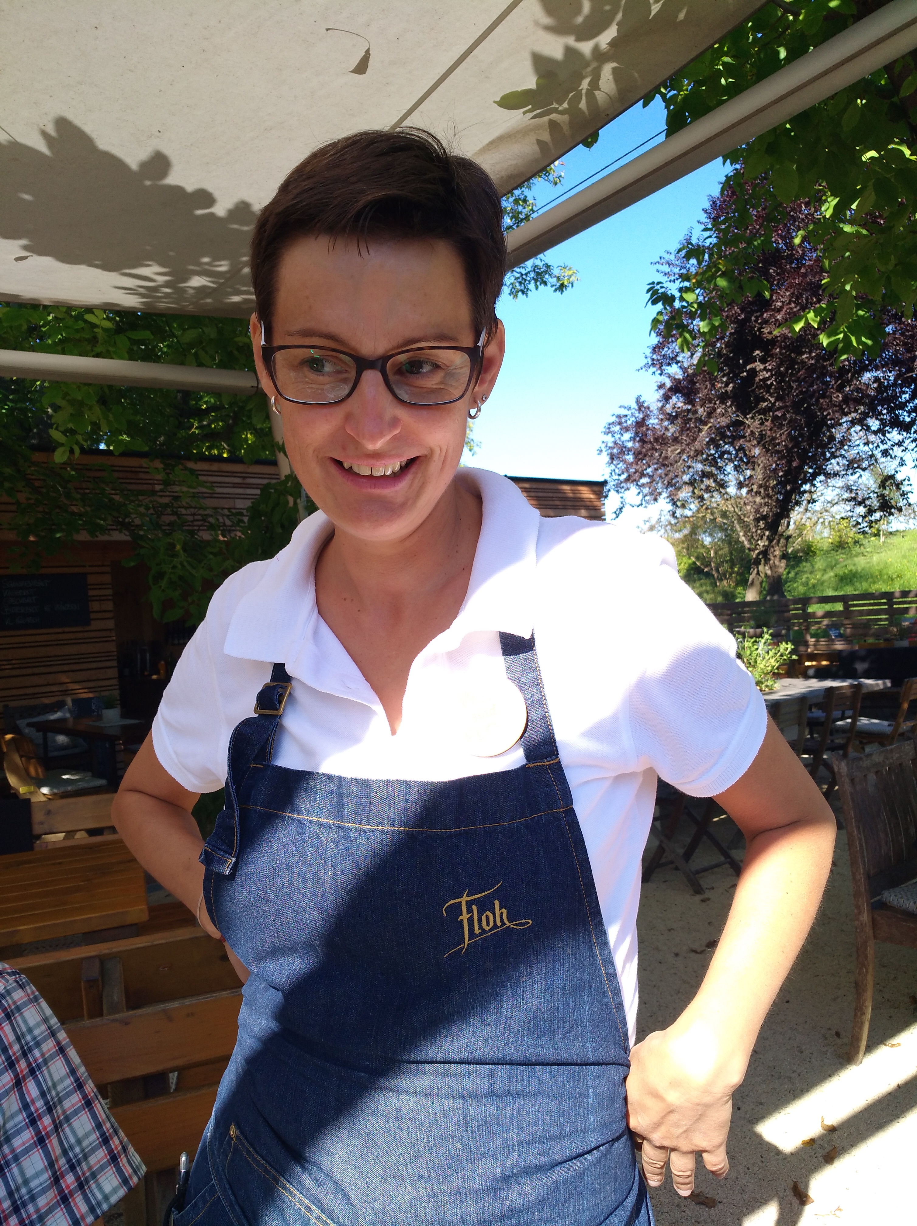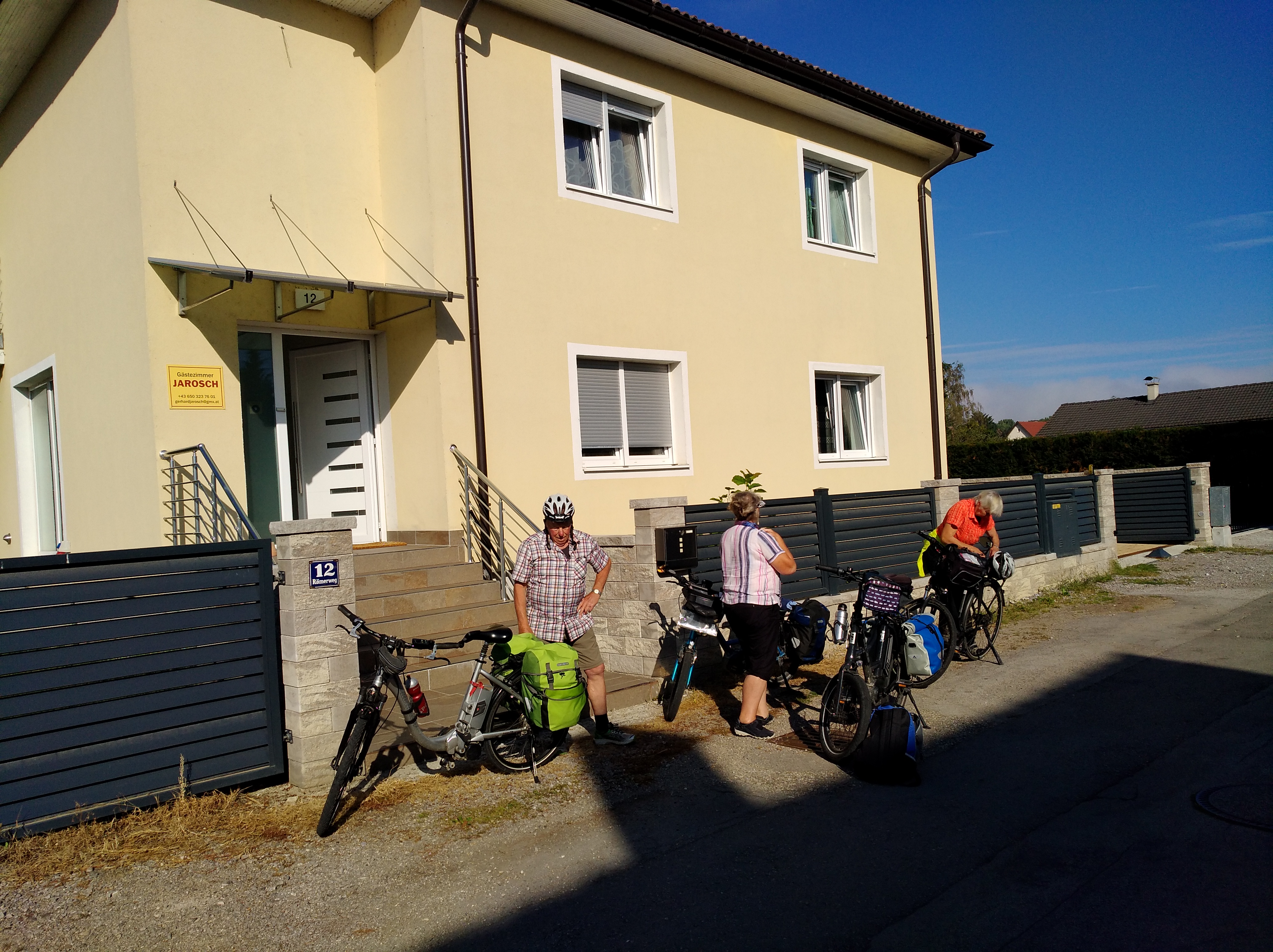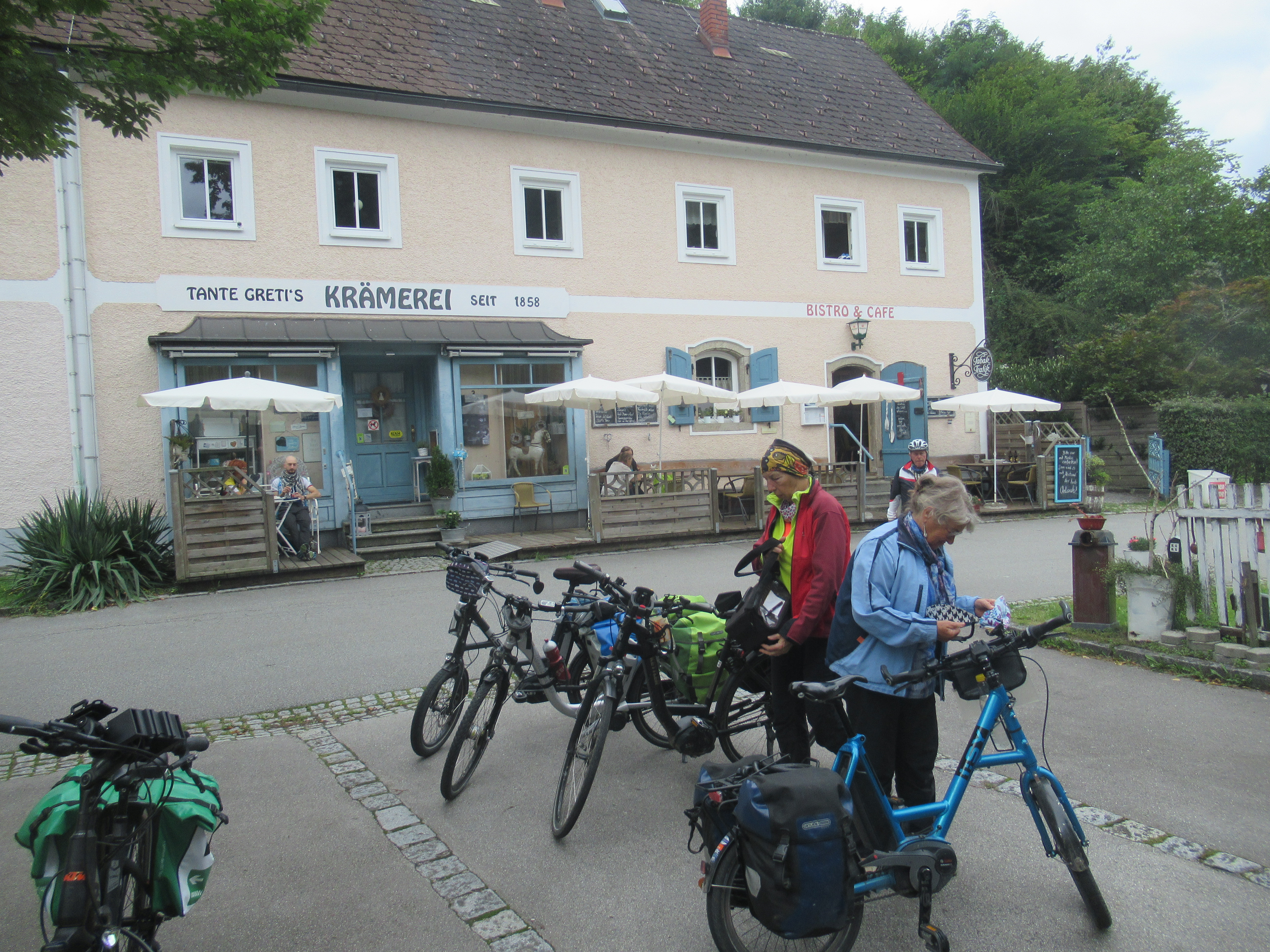 Bald nach dem Start stellt Johannes fest, dass der Akku nicht geladen ist und so kehren wir in einem schönen Gastgarten ein um „Saft zu tanken“. Es gibt mehrere Ladestationen, man ist auf saftlose Radelnde eingerichtet! Nachdem wir gerade vom Frühstückstisch aufgestanden sind, keinen Hunger verspüren Jedoch trotzdem was verzehren wollen, fragt Rosi die Bedienung, ob wir hier das, was wir sonst essen, trinken können. Die nette Frau Floh (Flohs Garten) ist recht verdutzt, als wir fröhlich losprusten.