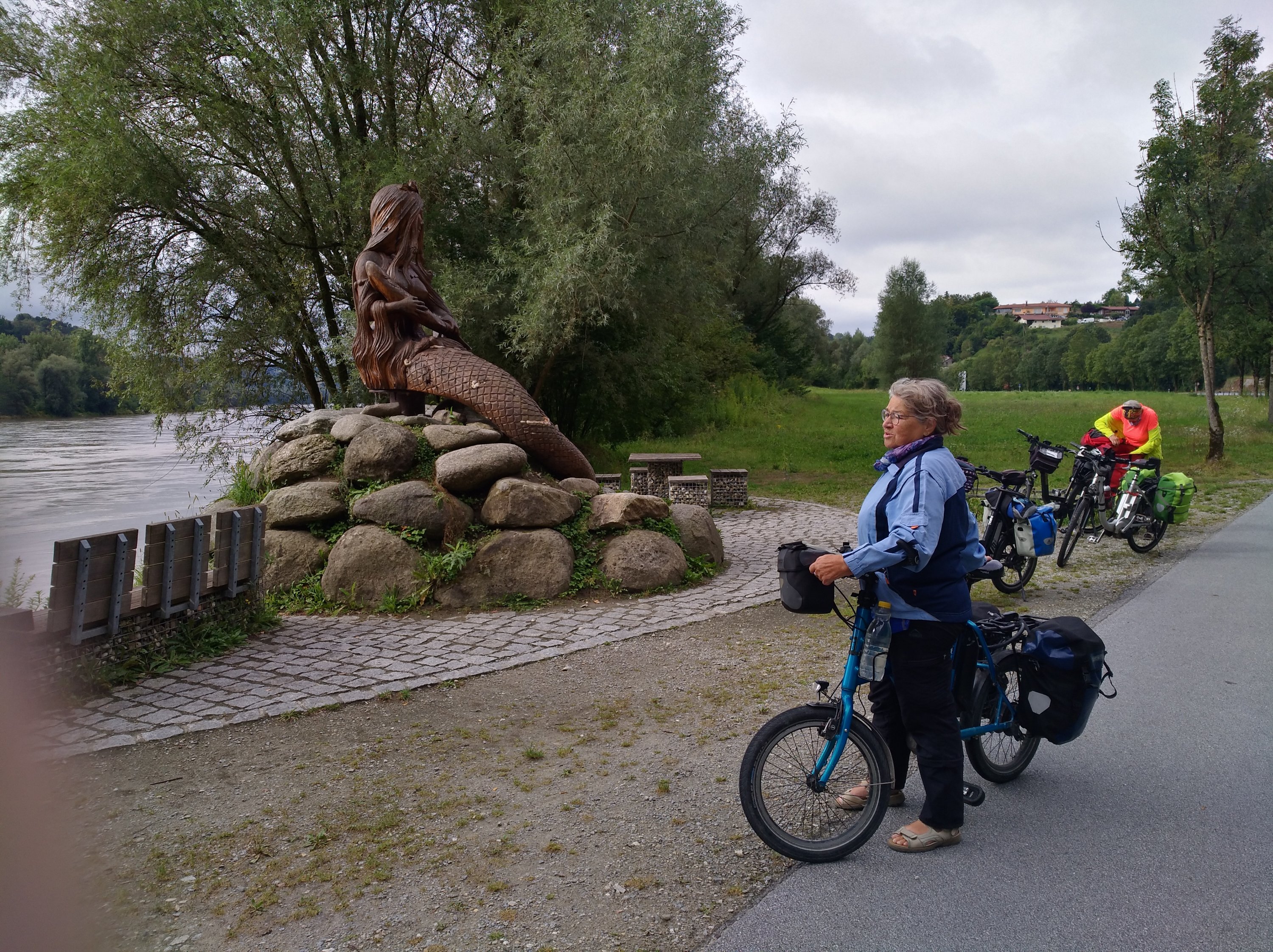 Heute geht’s los. Die Wetterprognose ist feucht. Wir sind gewappnet und radeln zunächst an der Ilz entlang bis zur Mündung in die Donau. Und dann rollen die Räder sehr entspannt und gemütlich auf dem flachen Donauradweg. Links der Donau gelangen wir zügig bis Obernzell. Hier gibt es ein Schloß mit schönem Garten aber leider keinen Kaffee.