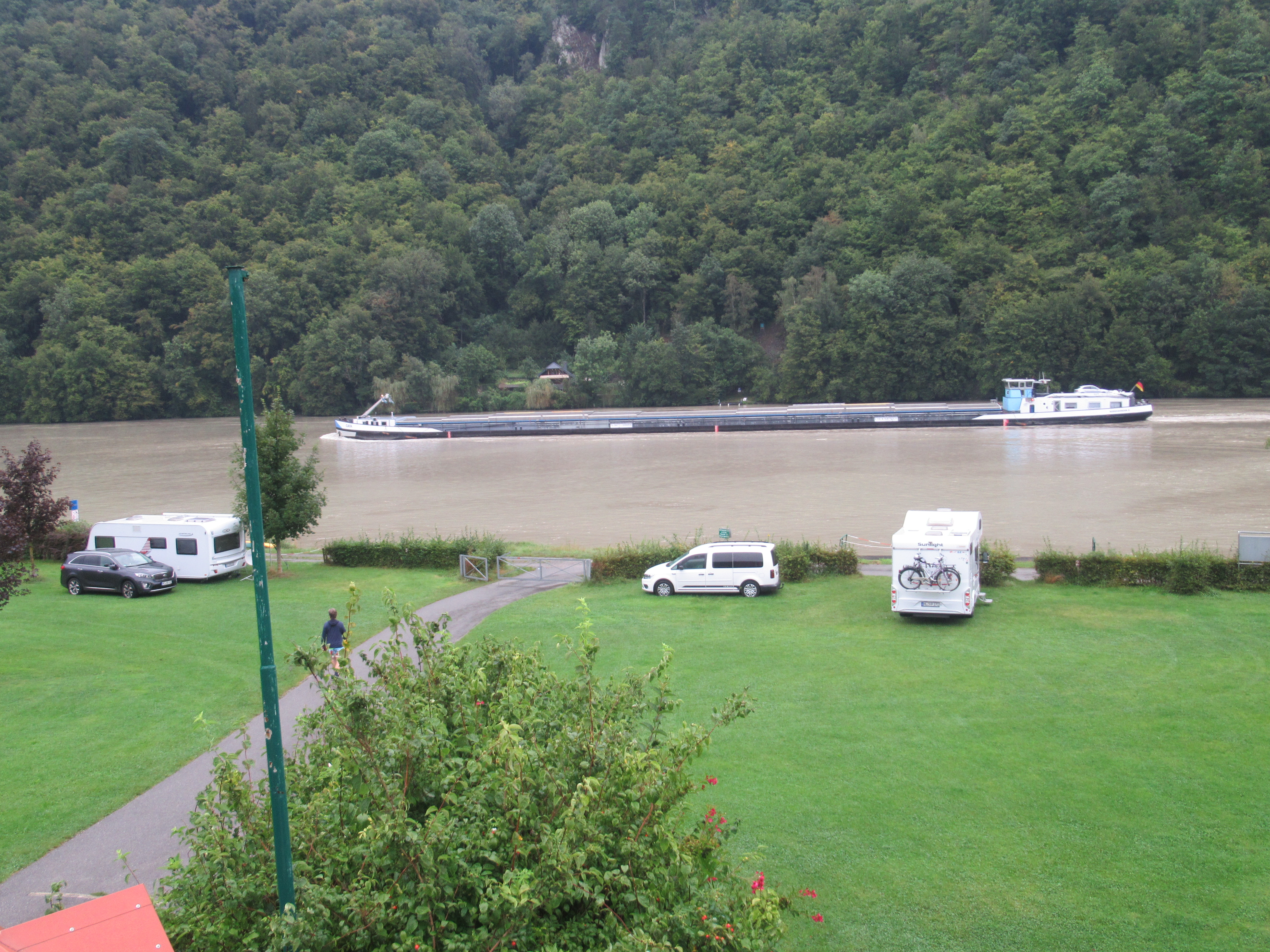 Die ganze Nacht hat es geregnet. Gegen 9.30 Uhr fahren wir los. Leider tröpfelt es immer noch ein wenig, aber das beeinträchtigt uns nicht. Der Weg am Fluss entlang ist breit, geteert und eben, es rollt! Links der Fluss, rechts grün. Ein Frachtschiff begleitet uns sozusagen. Es ist vollbeladen mit nagelneuen Transportern und flott donauabwärts unterwegs.