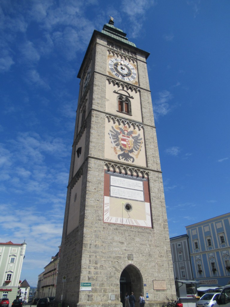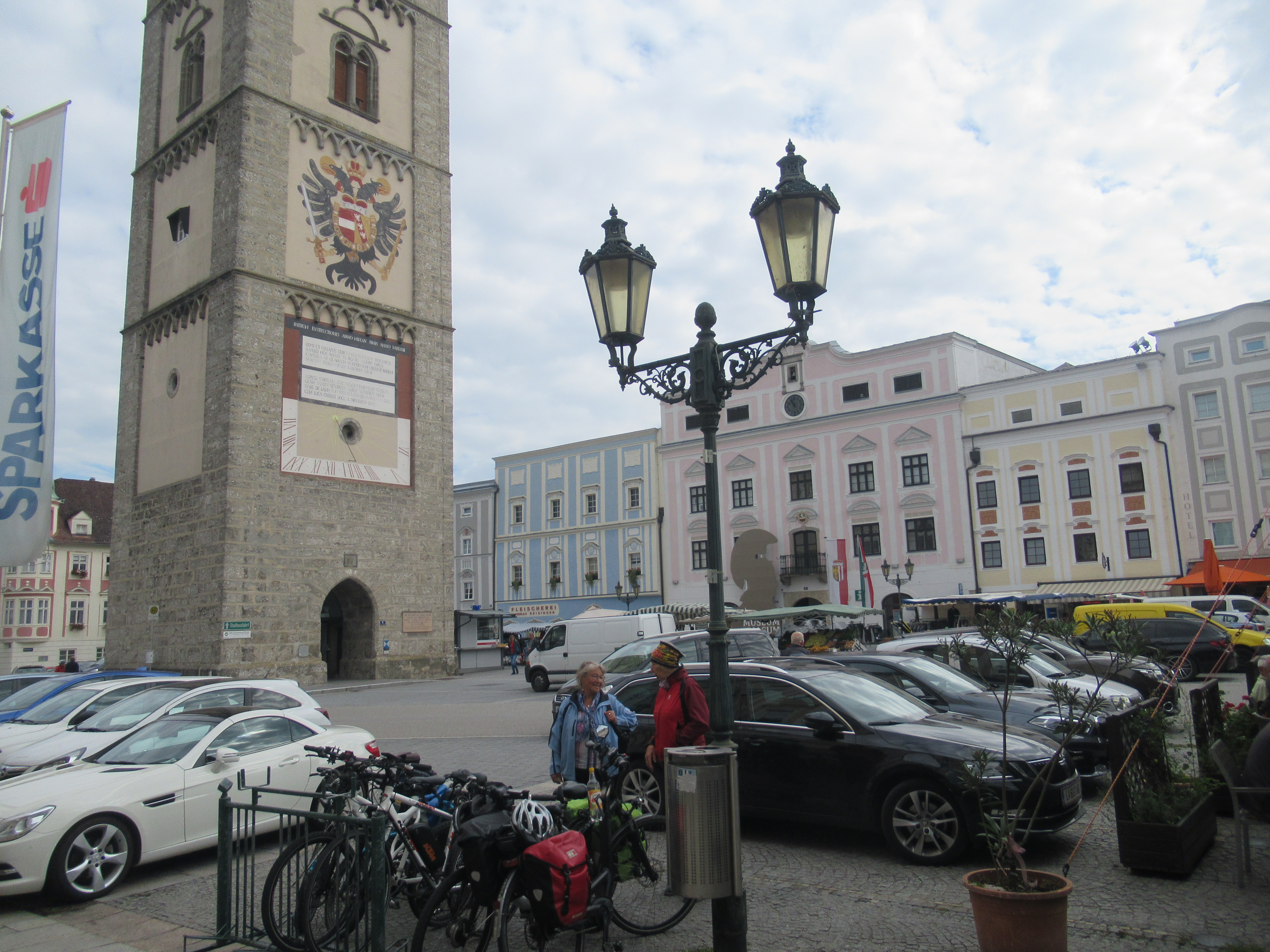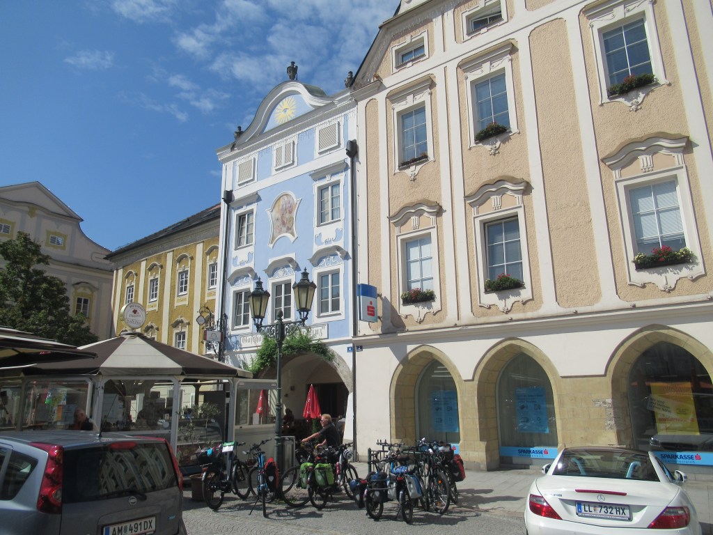 An der Staustufe wechseln wir die Seite und machen einen Abstecher nach Enns. Heute ist Markttag und entsprechend einiges los. Wieder gibt es schöne Hausfassaden zu bewundern!