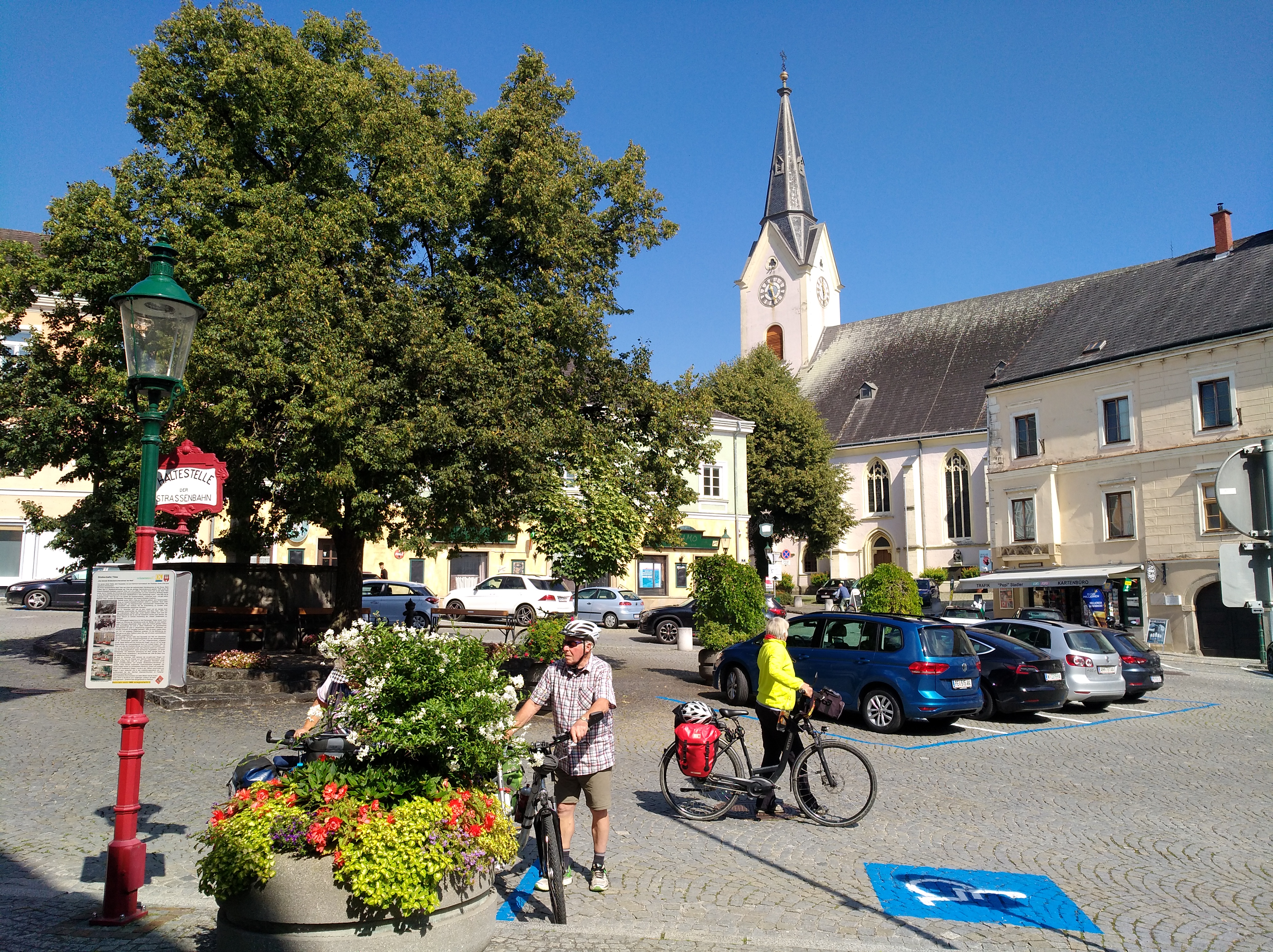 Auf der falschen Seite, links des Flusses, fahren wir rasch ca 20 km bis Persenbeug. Es ist ätzend, da direkt an einer stark befahrenen Straße und meist ohne Radstreifen. Nach der Kaffeepause wechseln wir die Seite und gelangen nach Ybbs mit seiner netten Altstadt. Früher gab es hier sogar eine Linie „Elektrische“, weil man unbedingt den Anschluss an die neue Zeit und die Eisenbahn behalten wollte.