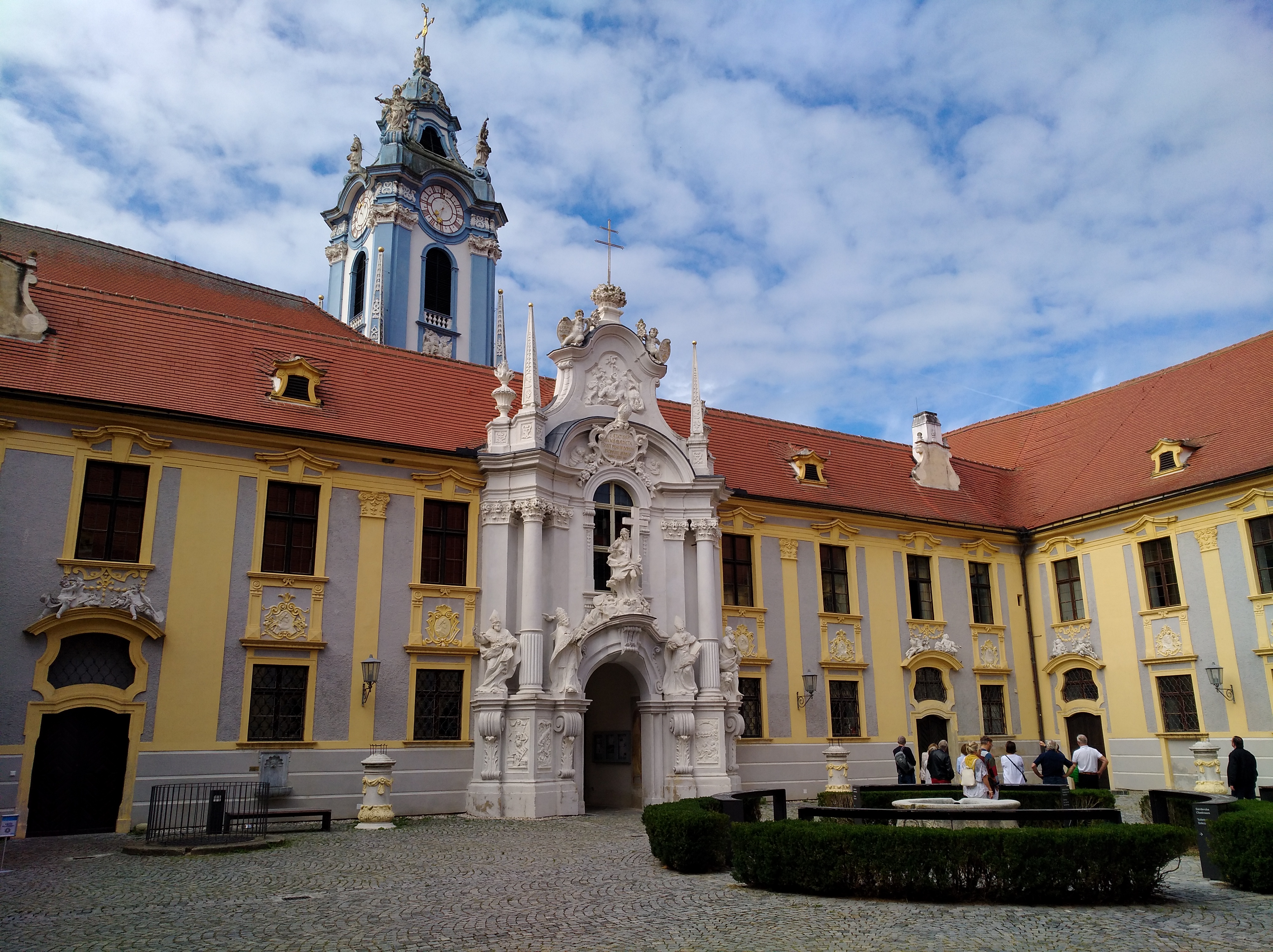 Unser nächstes Ziel ist Dürnstein, das Cochem der Wachau. In einem Lied von Georg Kreisler singt er davon, dass „die Donau grad bei Dürnstein doch so wunderschön“ sei. Die Abtei samt Kirche kostet relativ viel Eintritt, so dass wir nur den brocken Innenhof besichtigen. Über den Portalen sind Figuren zu bewundern. Die vier Jahreszeiten, vier! Erteile sind dargestellt und noch so einiges. Ein großer Spiegel ist so aufgestellt, dass die Fotografierenden sich vor dem Portal stehend ablichten können.