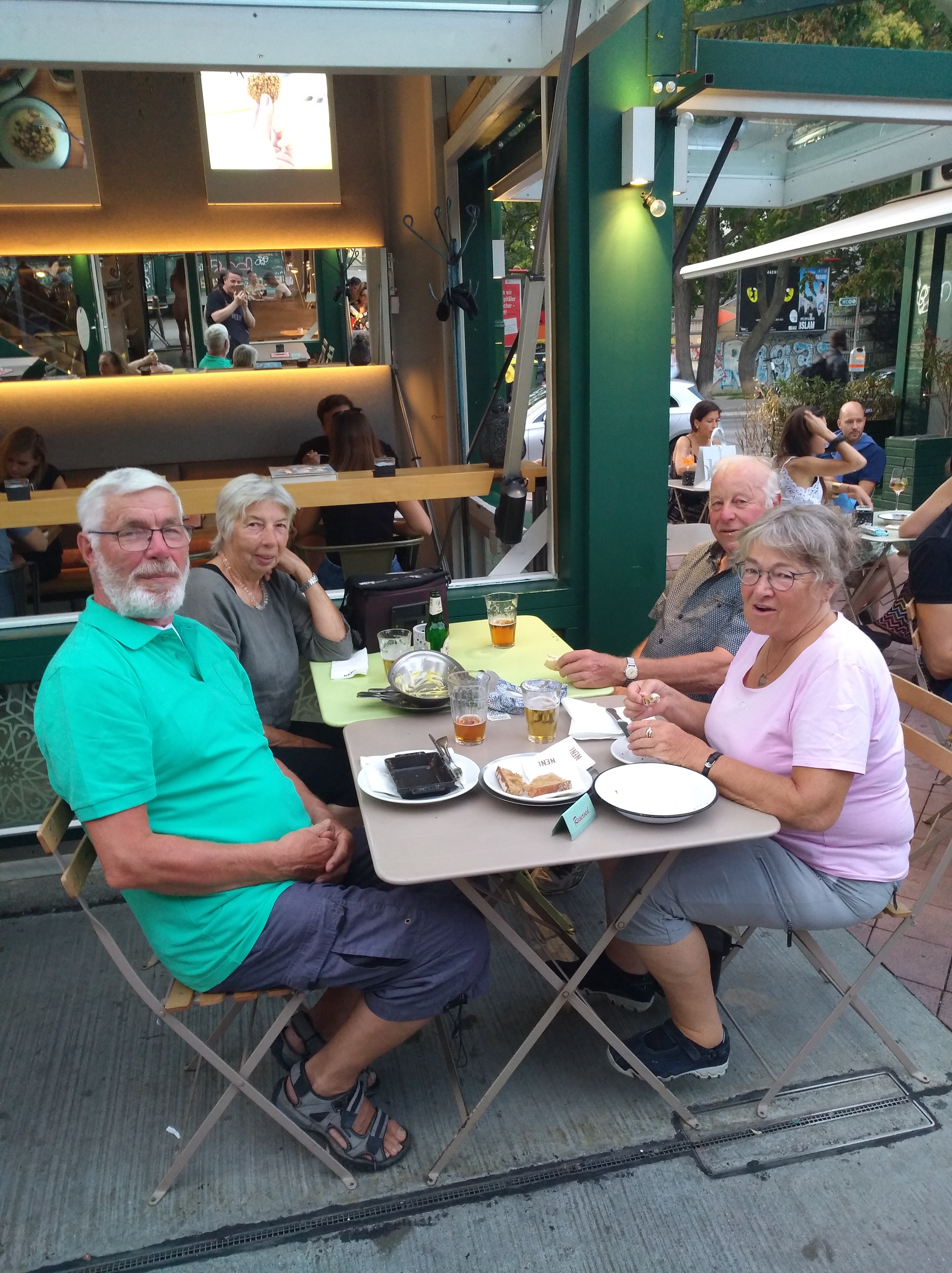Abendessen gibt es auf dem Naschmarkt bei Neni, eine Familie mit Wurzeln in Nahost und Europa. Entsprechend ist das Speisenangebot, es geht genauso drunter und drüber wie in einem orientalischen Bazar. Es duftet nach Gewürzen und ich bekomme endlich mal vegetarisches, welches nicht nur aus Kaspressknödeln oder Spätzle besteht. Mamas Meatballs und Jerusalemteller begeistern die beiden Männer, alles lecker.