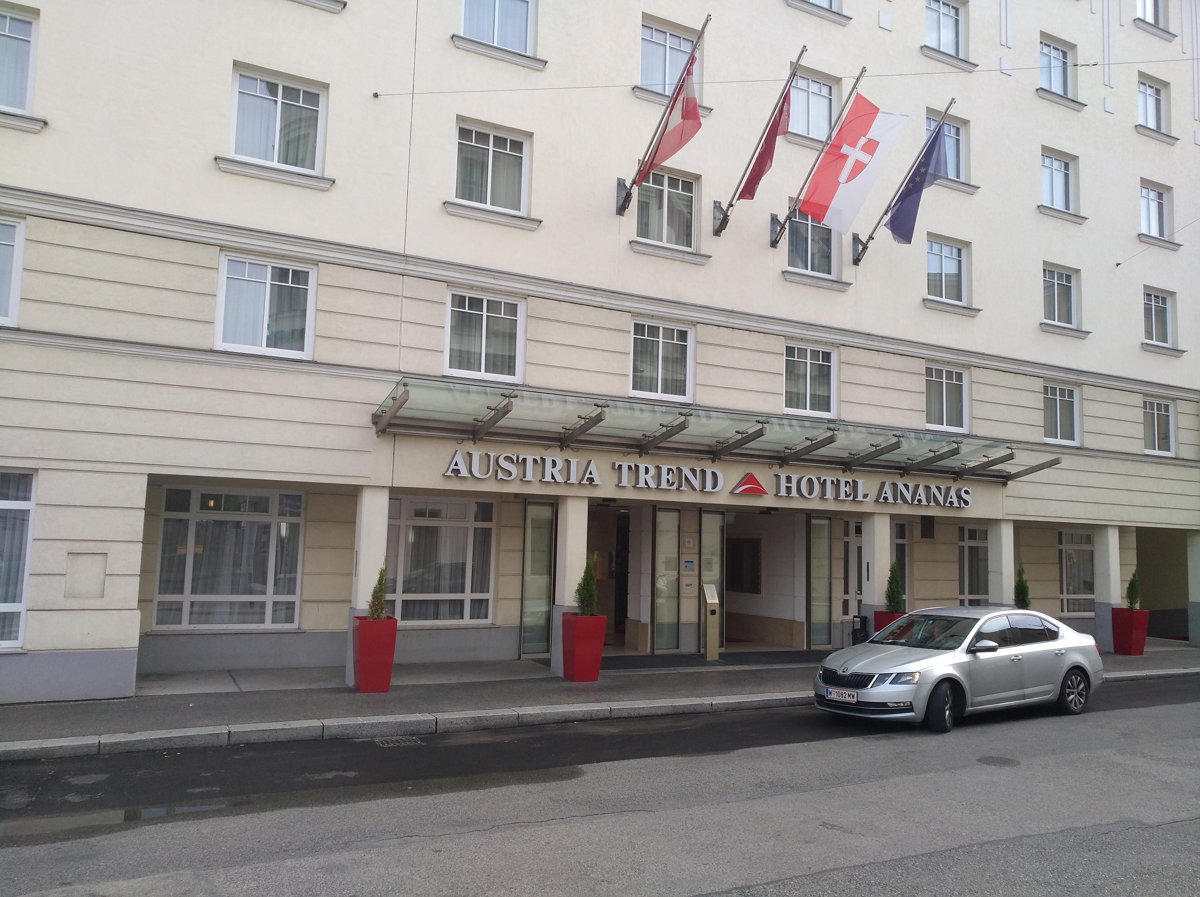 Nun gelangen wir ans Ziel der Reise. Wien empfängt uns. Wir finden das gebuchte Hotel Ananas nach einer Fahrt vorbei an der Hofburg und dem Naschmarkt und stellen erfreut fest, dass wir sehr zentral untergekommen sind. Wir beziehen eine Suite im sechsten Stock. Schöne zweckmäßige Zimmer, Badewanne, sep. Toilette.