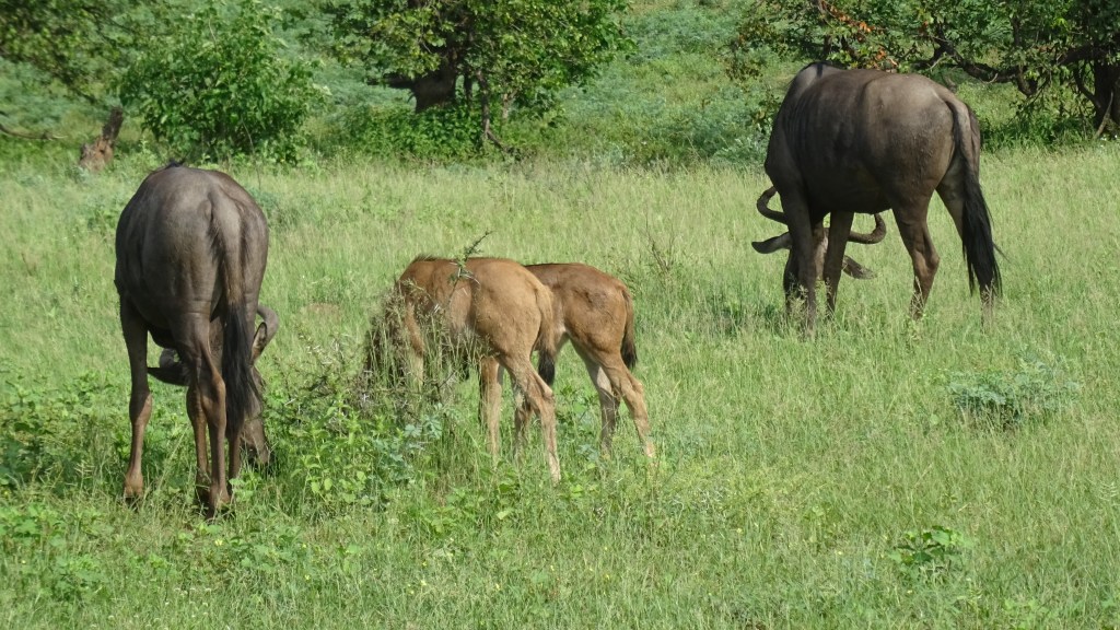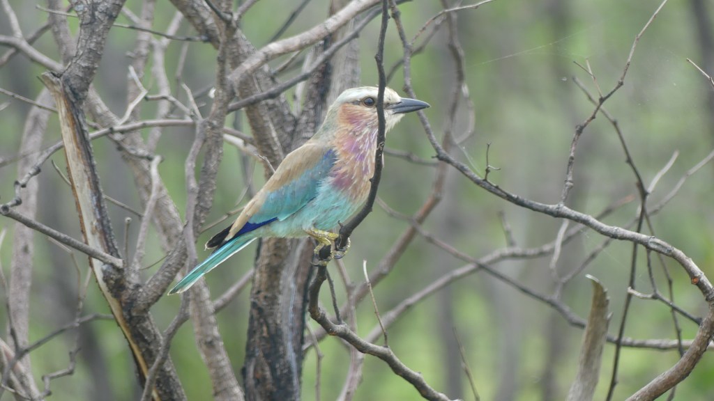 Neben den üblichen Verdächtigen wir Zebras, Streifengnus samt Jungtieren, Elefanten, Impalas treffen wir an Wasserstellen auf storchenartige Vögel, fotografieren einen Rosapelikan und beobachten Weißbrustkormorane. Einige sehr schöne bunte Vögelchen erfreuen unser Herz. Grundblautürkis schillernde Federn mit leicht schwarz unterlegt – einfach nur wunderbar!!!