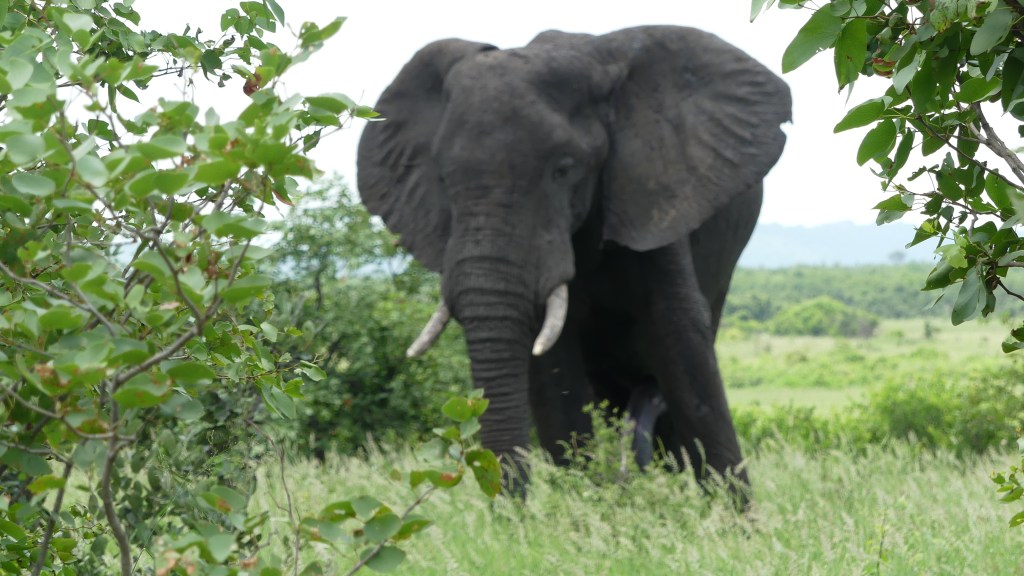 Am Wasserloch sehen wir Kronendücker, auch Strauße spazieren gemütlich durchs Gras. Elefanten machen einen Spaziergang und stopfen sich dabei das offensichtlich leckere Grünzeug ins Maul.