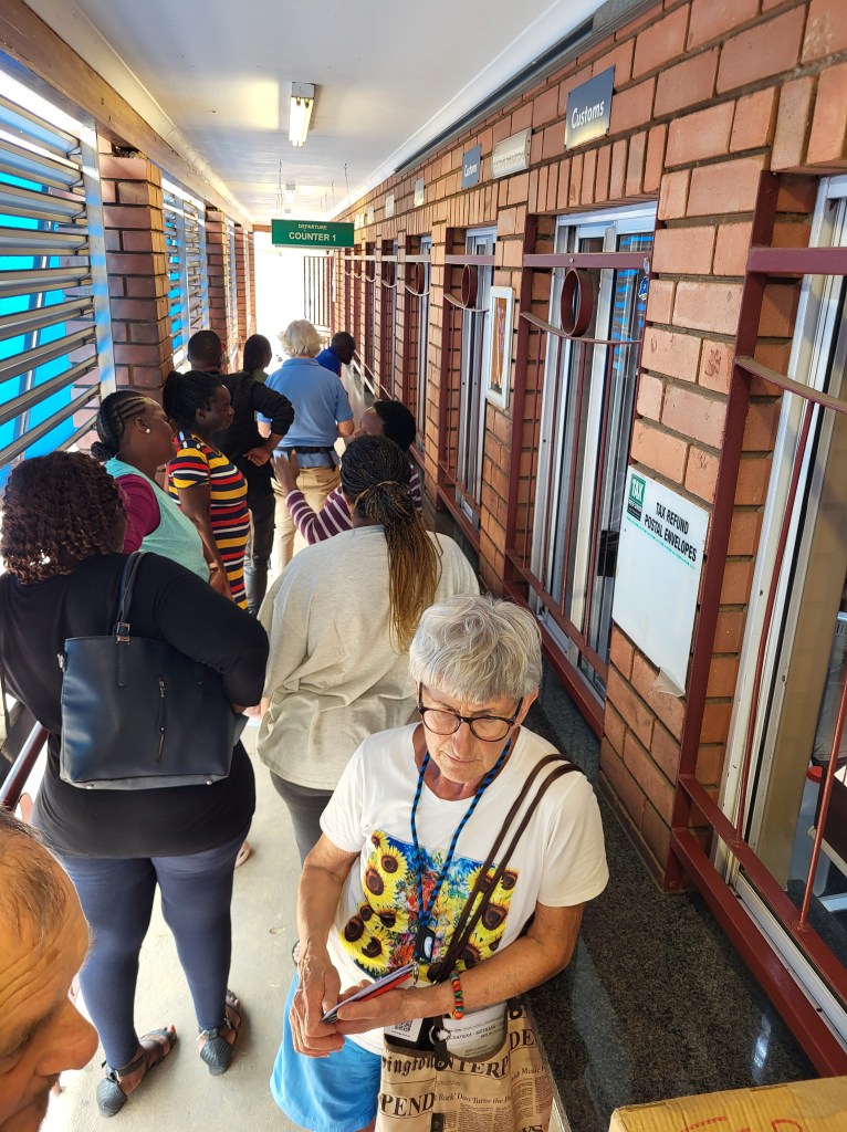 An der Grenze staut sich alles, LKW’s stehen kreuz und quer, nix geht. Mit afrikanischer Gelassenheit holen wir uns unsere Laufzettel für die Einreise, bezahlen alles brav und hoffen auf rasche Weiterfahrt. Nach gut eineinhalb Stunden geht es endlich weiter. Vorher werden noch die Schränke kontrolliert, denn wir dürfen keinerlei Lebensmittel einführen. Auf welche Art Lebensmittel sich das bezieht, erschließt sich uns nicht. Ich öffne brav alle Schubladen und Schränke, Zwiebeln und Äpfel sind offensichtlich keine Lebensmittel:)