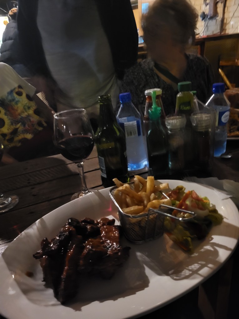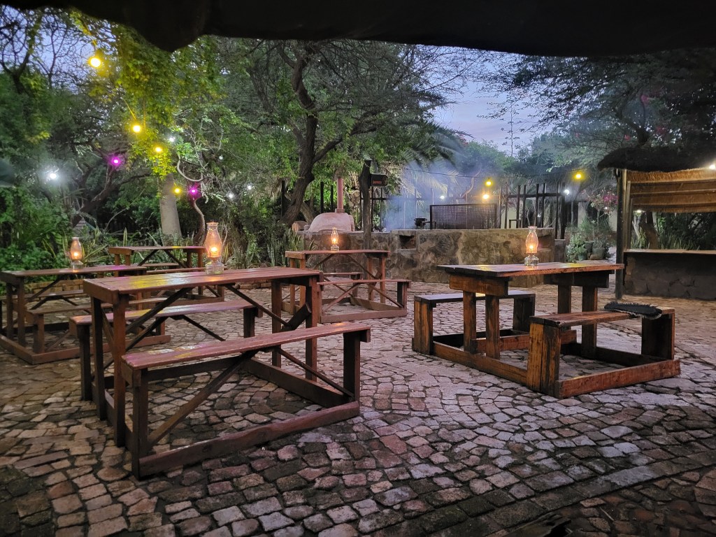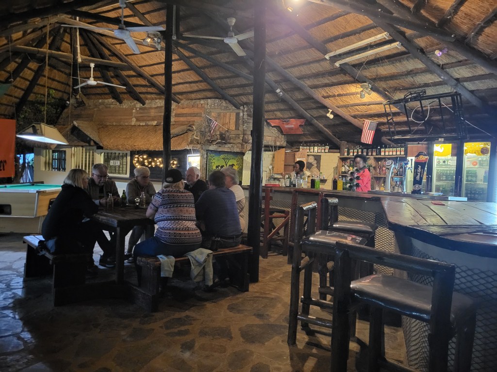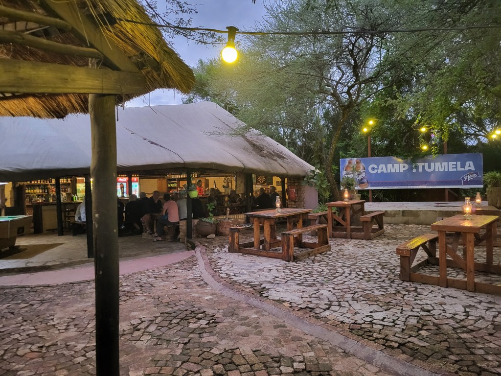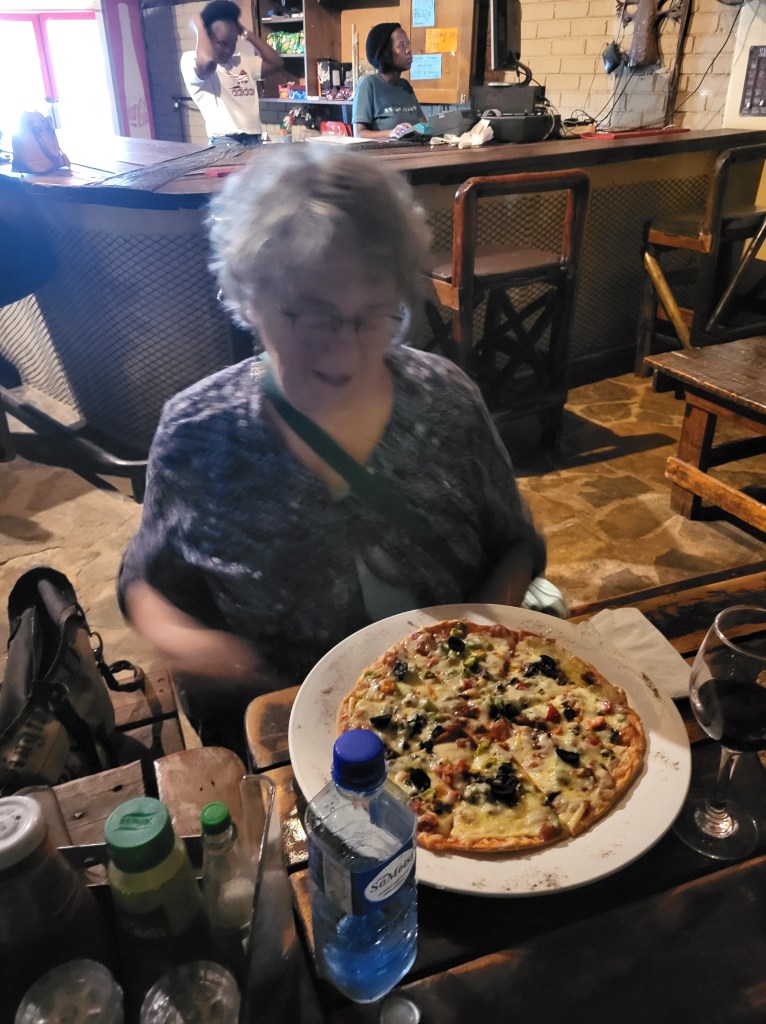 Im Camp Itumela wollen wir essen gehen und sind fast verhungert, bis das Essen serviert wird. Pizza mit Ketchup als Grundlage is nicht so mein Geschmack, auch die Männer, die sich 500g „Pork- Rips“ bestellt haben, sind nicht so ganz glücklich.
