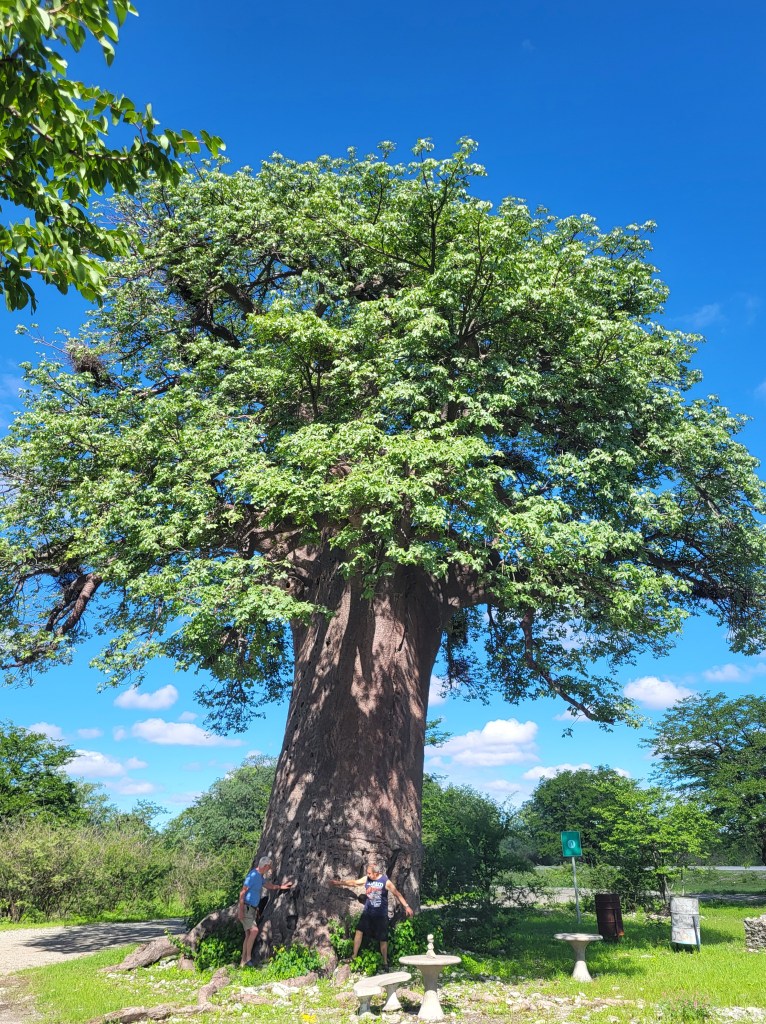 Von Nata bis Maun sind 325 km angegeben. Die Straße führt durch eine weite, offene Savanne, eine Salzpfanne. Davon sehen wir allerdings nichts. Dafür finden wir einen schönen Rastplatz unter einem riesengroßen Baobab-Baum. Die Baobabs sehen aus, als wären die Wurzeln oben. Sie werden sehr alt, sind gute Wasserspeicher, was sich die San und die Elefanten zu Nutze machen.