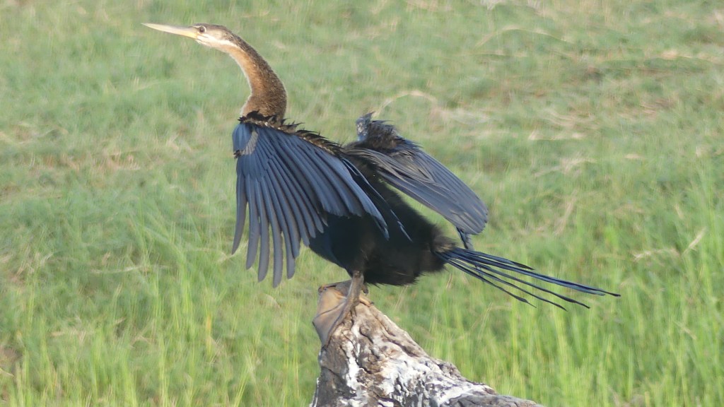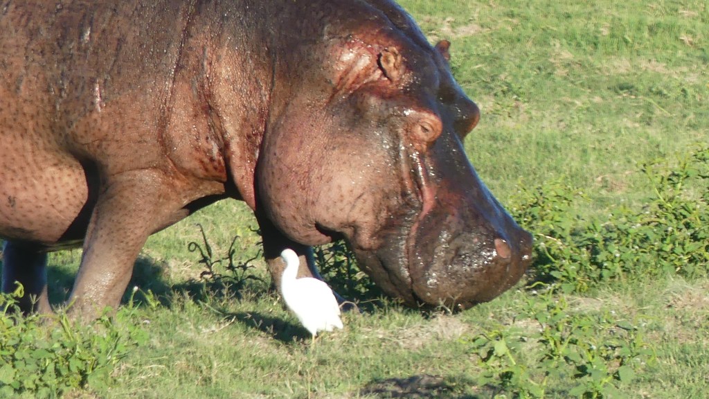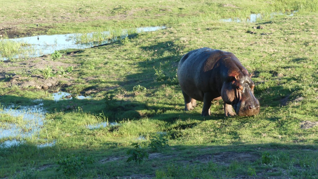 Marabus stehen in Mengen am Ufer herum, auch andere Vogelarten, die wir leider nicht benennen können. Plötzlich tauchen Hippos auf. Eines spaziert uns entgegen und trifft unterwegs auf einen Rivalen oder zumindest ein anderes Hippo. Im Wasser gibt es ein Kämpfchen – zur Freude Aller. So richtig will das große Tier nichts mit uns zu tun haben, es dreht ab, verabschiedet sich mit heftigem Schwanzwedeln und verteilt dabei seinen Kot gleichmäßig in der Landschaft.