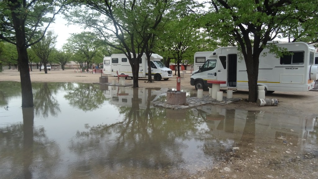 Im Camp Halali angekommen, suchen wir erstmal Strom – leider springt die Sicherung ständig raus – es ist ermüdent. Das Womo samt Bett ist eine einzige „Staubsammlung“, durch jede Ritze ist der feine Sand gekrochen und wir müssen alles ausschütteln und frisch beziehen.