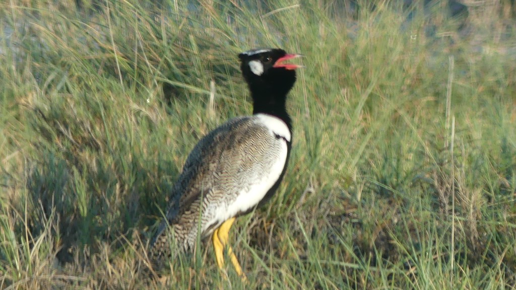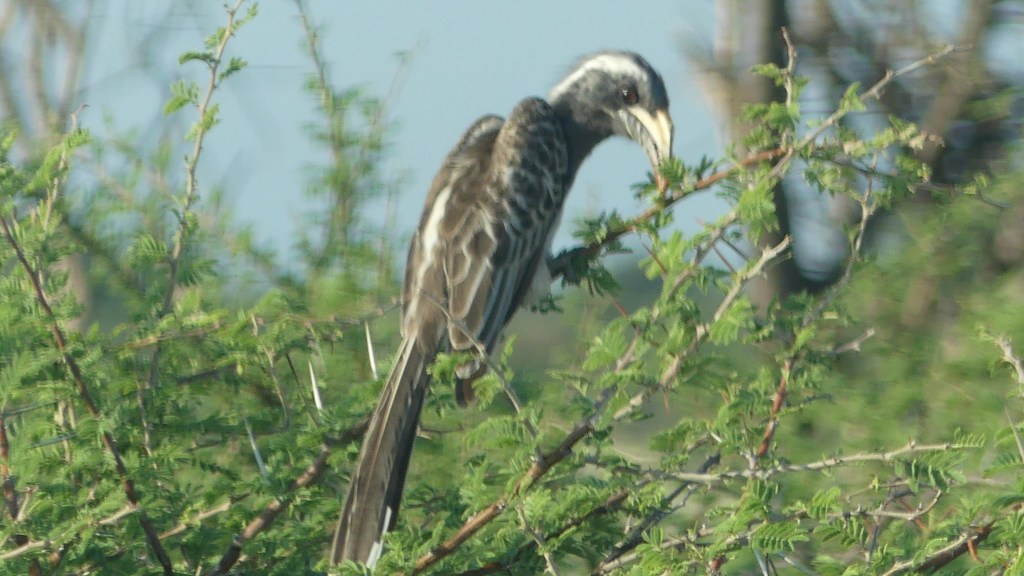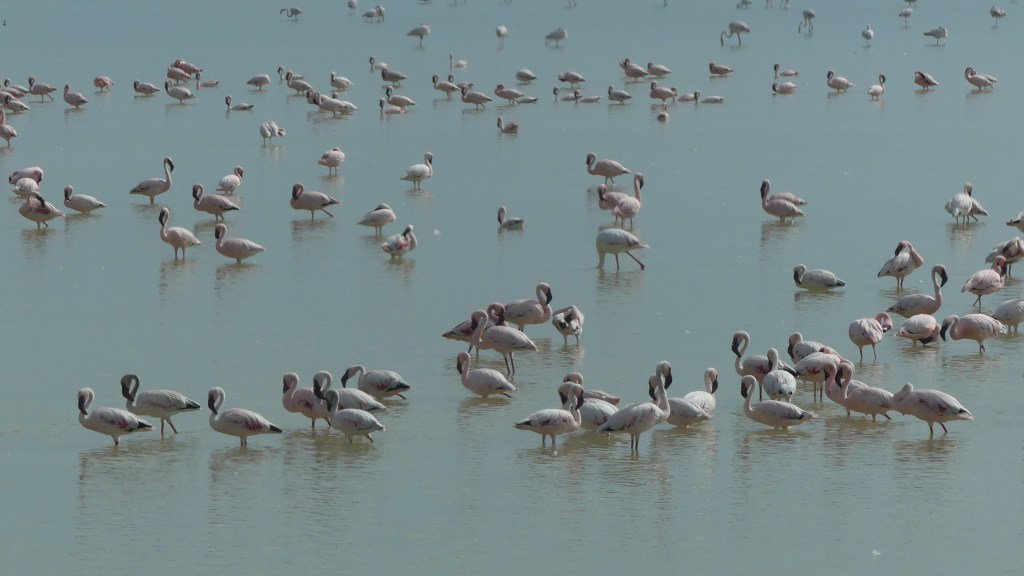 Wir fahren dann weiter und finden die üblichen Verdächtigten wie Zebraherden, Giraffen, Oryx-Antilopen. Unzählige Flamingos schreiten durch ein Wasserloch und erfreuen uns mit ihrem rosa Gefieder, wunder-wunderschön! Vögelchen sind heute unsere Beute, Große und Kleine. Strauße gibt es ebenfalls zahlreich. Ansonsten ist die Strecke durch den Park gekennzeichnet von Schotter und Potholes.