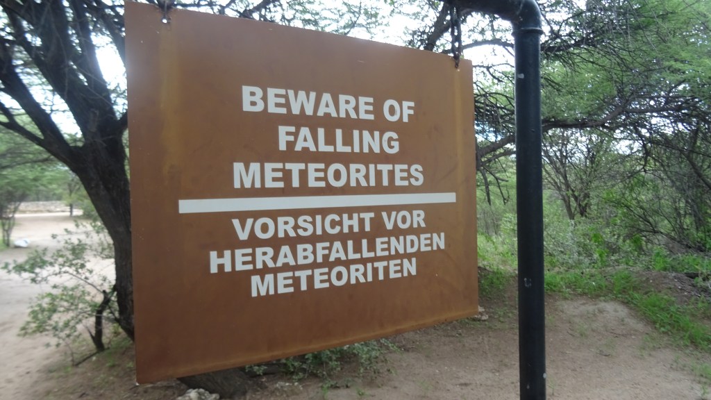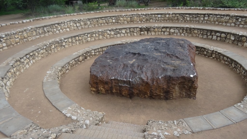Kurz vor dem Camp statten wir dem Hoba-Meteoriten einen Besuch ab. Dieser riesige Eisenbrocken ist weltweit der größte und vor ca 80 000 Jahren vom Himmel gefallen. 1920 wurde er vom Bauern der Hoba-Farm entdeckt. Das Teil besteht zu knapp 83 % aus Eisen, 16 % aus Nickel und 0,76 % aus Kobalt, wiegt rund 60 Tonnen, 3 Meter lang und zwischen 55 cm und 100 cm stark. Beeindruckend!!! Als Veronique hört, dass die Region unter einer Dürreperiode leidet versucht sie, mit Hilde des Meteoriten um Regen zu bitten. Und siehe da, ein paar Stunden später kommen heftige Gewitter mit Sturzregen!