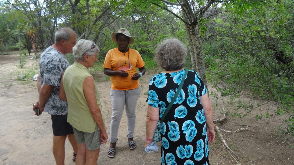 Die Guide erklärt uns alles genau und hat viel Spaß mit uns. Ein paar Brocken Deutsch spricht sie neben anderen Sprachen und wir bekommen eine Vorführung der Klicksprache ihres Stammes.