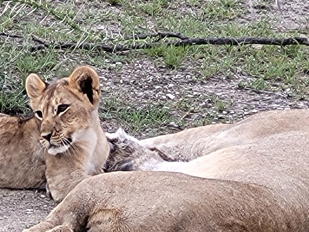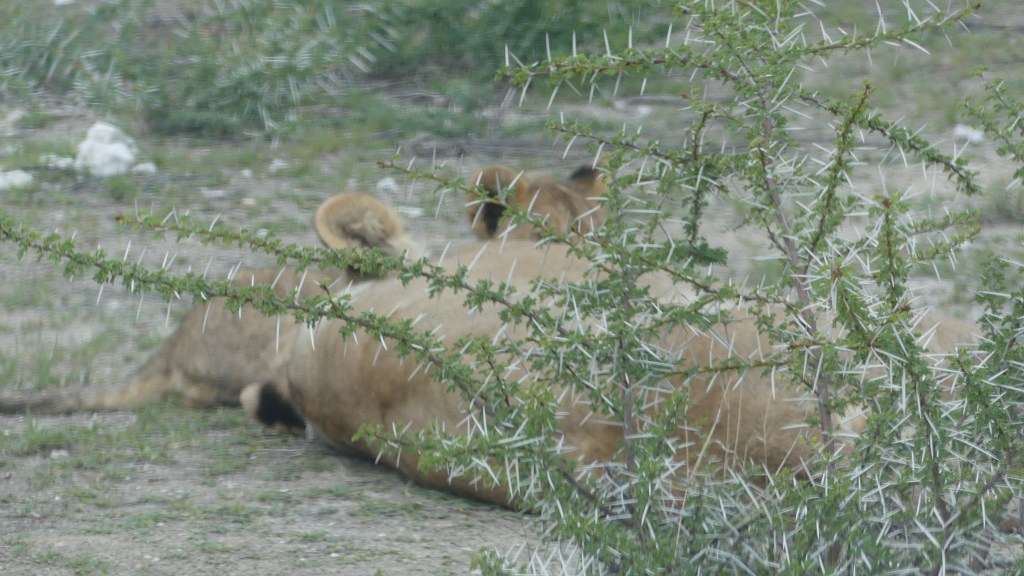 Die Straßen sind heute zwar nicht mehr ganz so staubig, dafür steht Wasser in allen Vertiefungen. Ein paar mal müssen wir wenden, weil es undurchschaubar ist, ob wir mit den Womos durchkommen. Wir fahren beinahe von Anfang der Reise an mit Kurt und Eliane. Das klappt prima! Kurt hat ein Walkie-Talkie und so können wir uns ohne Probleme absprechen. Auf dem Weg zum Gemsbokvlakte sehen wir ein paar Löwenweibchen und ein Junges! direkt an der Straße, fast streichelnah!