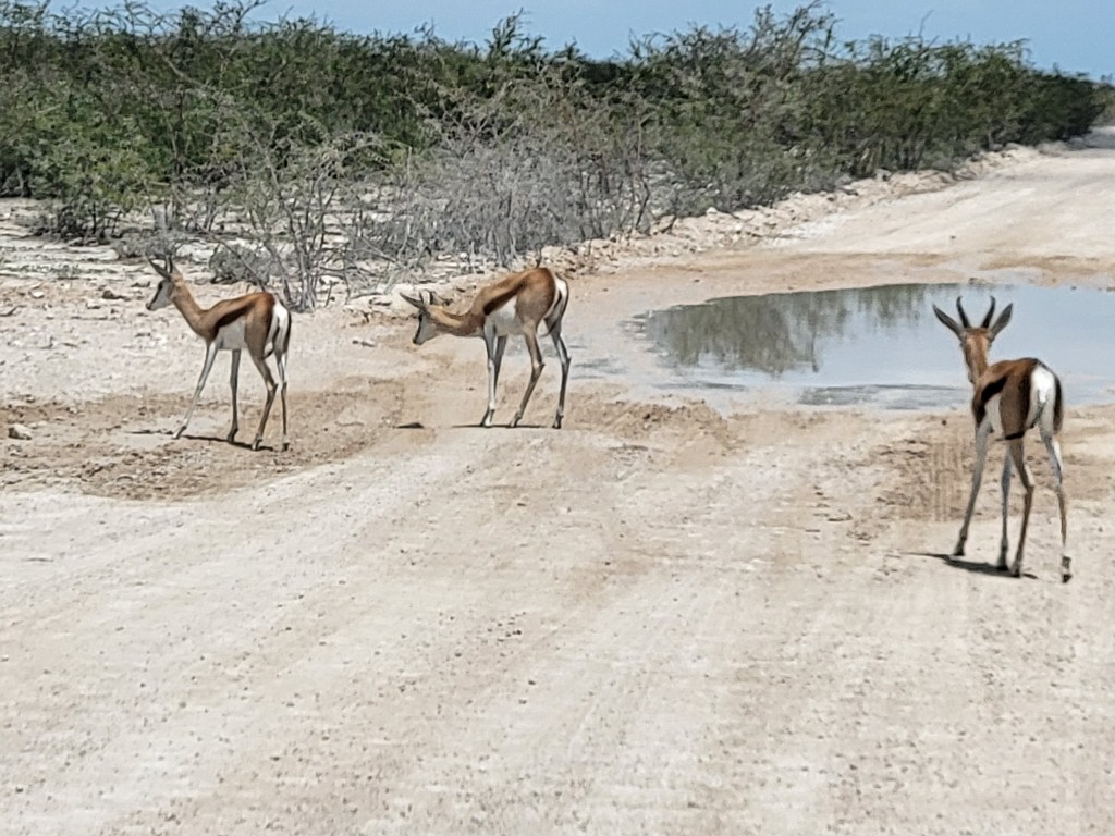 Die weitere Fahrt zum Camp Okaukuejo ist etwas abenteuerlich. Riesige Pfützen müssen durchquert werden, das Wasser spritzt hoch und gelegentlich so viel auf die Windschutzscheibe, dass wir völlig blind werden. Die Strecke ist sehr sehr holprig, wir werden gut durchgeschüttelt. Ansonsten ist es öde und deprimierend. Viel Landschaft ohne echten Bewuchs, weit und flach, alles grau durch den Staub.