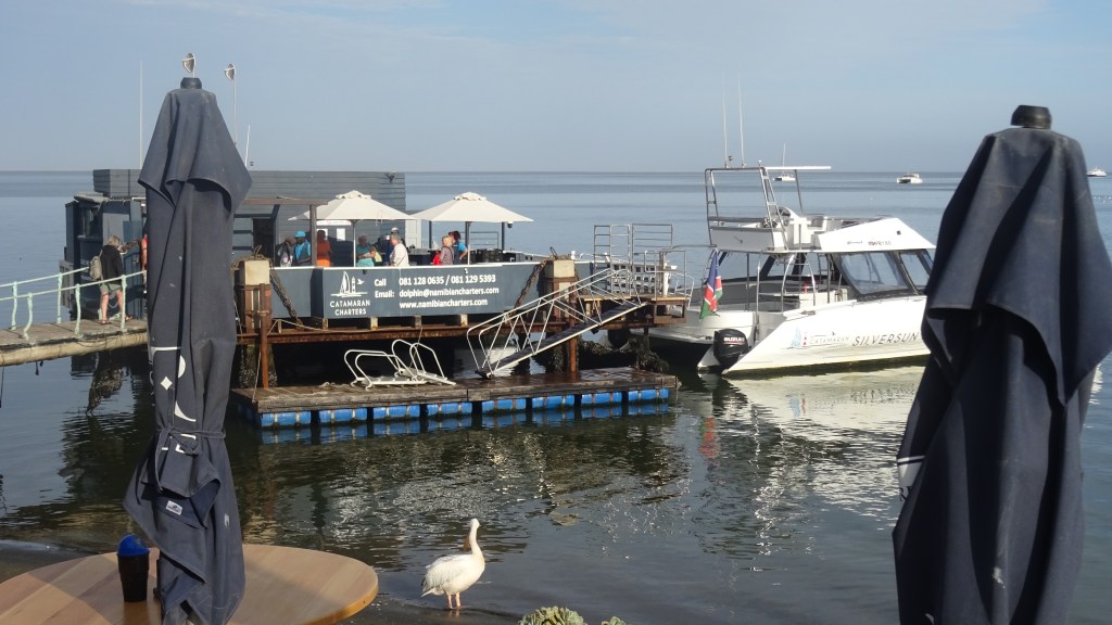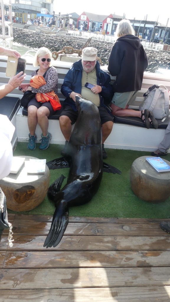 Wir werden per Kleinbus dorthin gebracht und besteigen ein Boot, mit welchem wir hinausfahren um Robben und anderes Seegetier zu sehen. Schon im Hafen kommen Ohrenrobben aufs Boot, geduldet von den Bootseignern, weil es den Touris Spaß macht. Und die Robben bekommen Fisch als Danke schön für ihren Besuch. Auch Pelikane schauen nach uns (oder nach den Fischen im Eimer von Mr Jacksen)