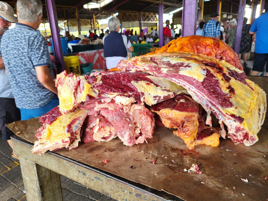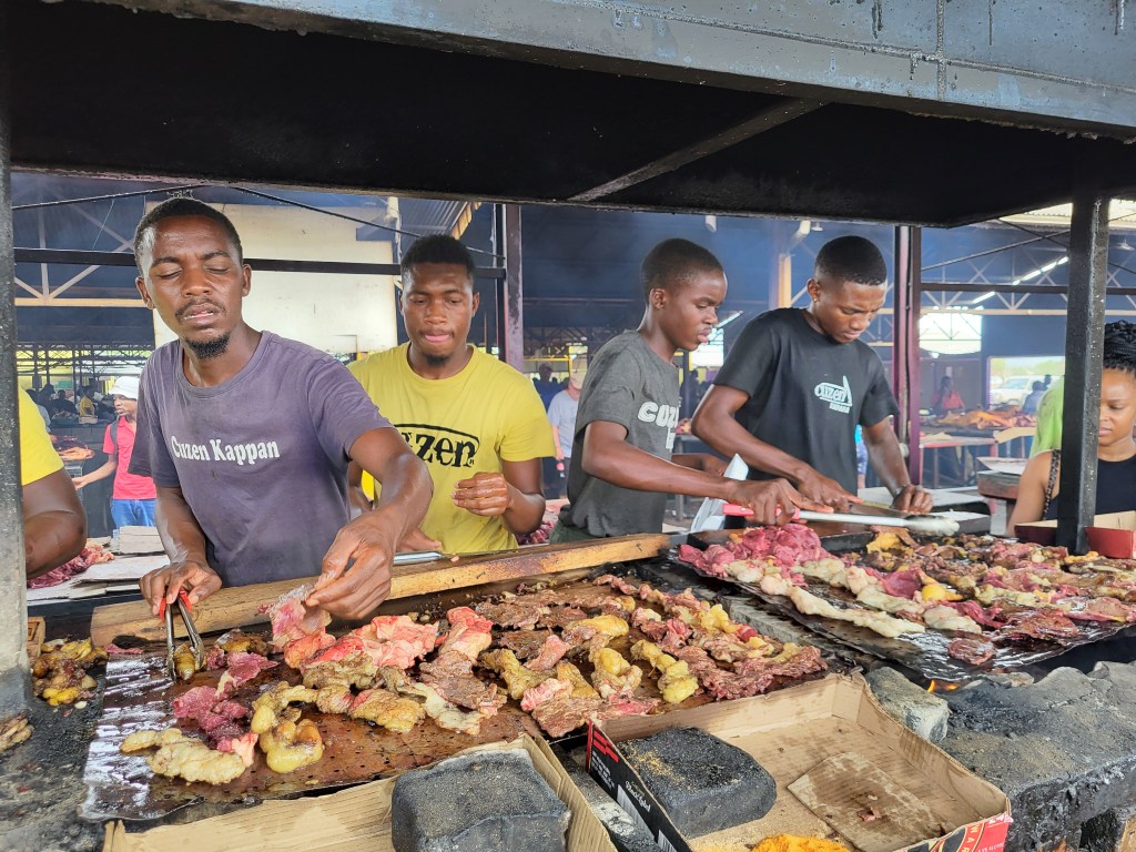Die Erklärungen dürftig und der Guide gibt derart platte und doofe Witzchen von sich und dies auch in ständiger Wiederholung, dass es unerträglich wird. Zum Schluß fahren wir in das Viertel der Schwarzen Bevölkerung und dort auf den Markt. Hier wird viel Fleisch verkauft, auch gebraten als fast food angeboten. Natürlich gibt es auch Gemüse und Gewürze…..
