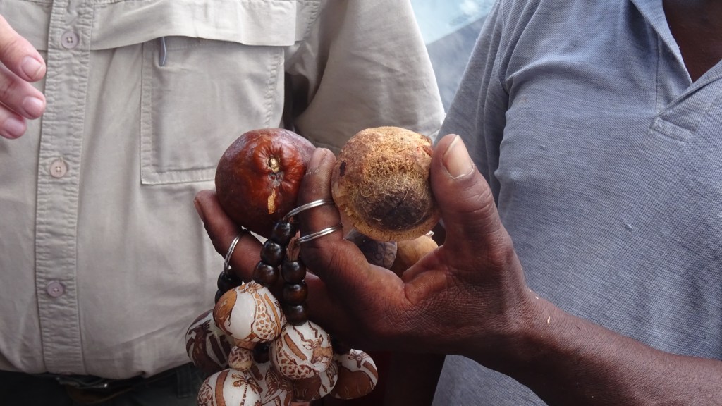 Dann beginnt die Stadtrundfahrt, die letztlich sehr enttäuschend ist. Zunächst zeigen uns Menschen aus der Volksgruppe der Nama, wie sie aus bestimmten Baumfrüchten durch Schnitzereien mit Skalpellen schöne Schlüsselanhänger gestalten und nach Wunsch mit dem Namen des zukünftigen Besitzers versehen. Das geht ratz fatz, bewundernswert.