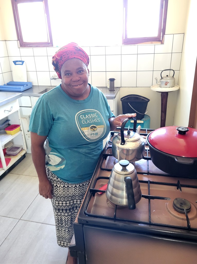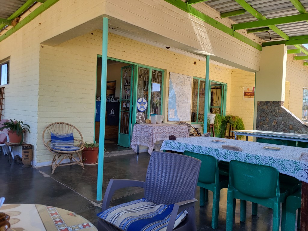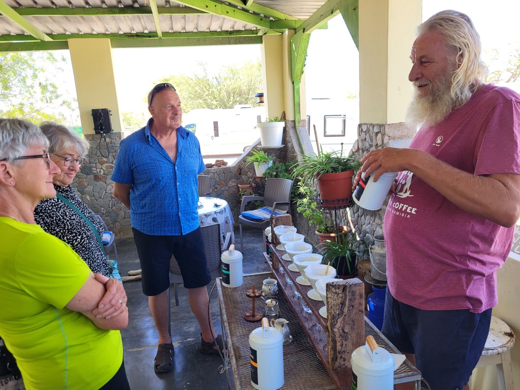 „Mein“ Osmand zeigt mir bei Klein Aub einen Rastplatz. Connys Coffee wird betrieben von einem Deutschnamibier, eine Oase in der Landschaft. Er bewirtschaftet nur einen Hektar Land, nicht wirklich eine Farm. Den Lebensunterhalt verdient es sich mit der Bewirtung von Touristengruppen. Er zelebriert afrikanischen Kaffee aus den verschiedenen Regionen und in den verschiedenen Geschmacksrichtungen von Stark bis mild. Kreativ kocht er zB mit einer Kochkiste, dadurch unabhängiog von Strom, der ja nicht immer zur Verfügung steht. Er nimmt sich viel Zeit um uns so einiges aus der Historie und aus der Gegenwart zu erzählen. Interessant fand ich die Darstellung seines Lebens. Aufgewachsen in der Apartheidszeit hat er diese „Kultur“ als völlig normal empfunden. Erst durch seine Reisen in alle Welt wurde ihm wirklich klar und bewusst, dass Apartheid nicht das A und O im Zusammenleben der Menschen sein kann. Nach acht Jahren in Hamburg überkam ihn die Sehnsucht nach Afrika und seither lebt er hier.