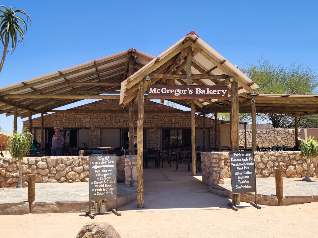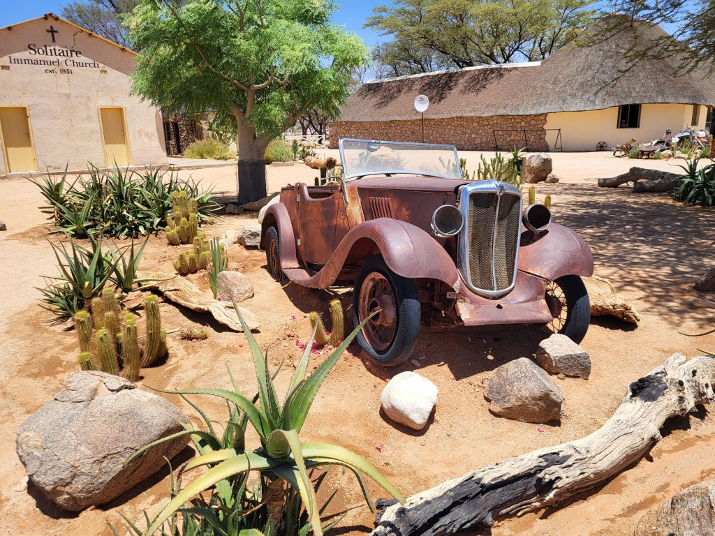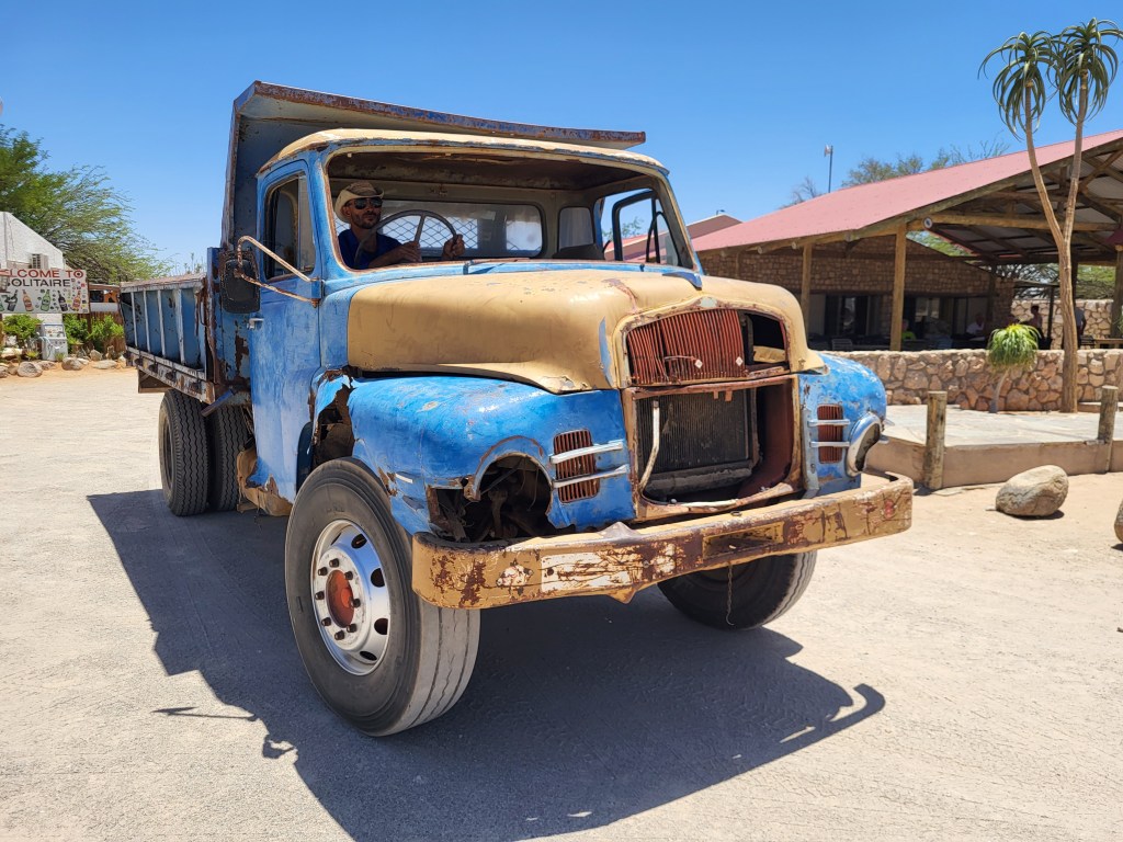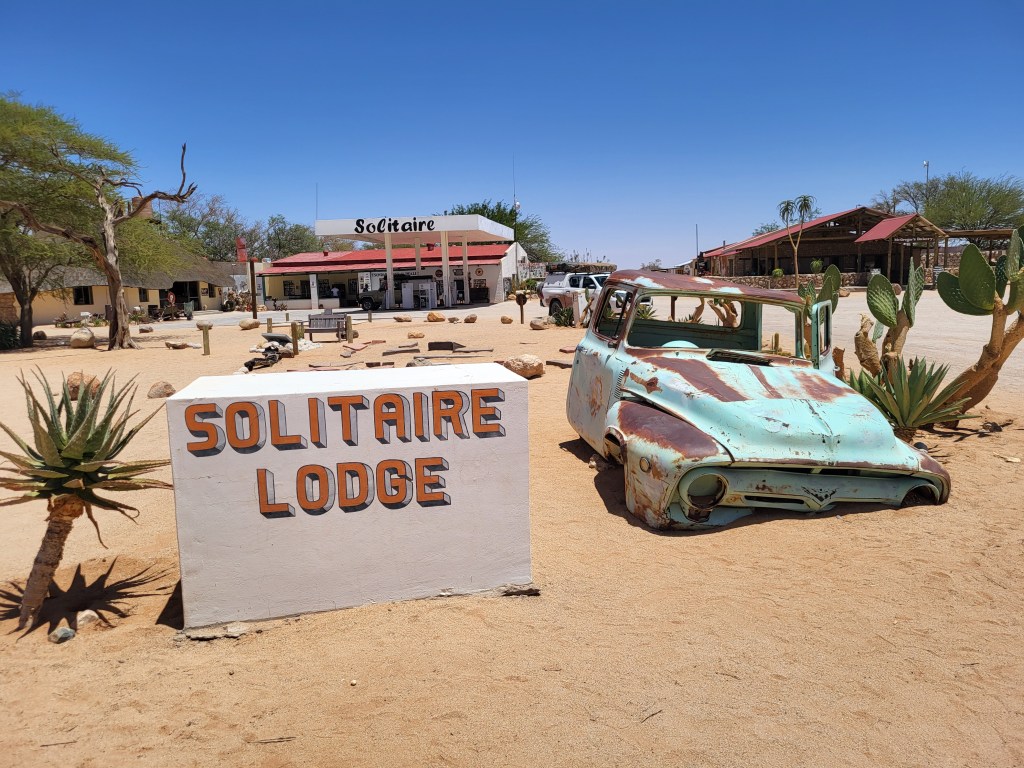 Zwischenstopp in Solitär. Tankstelle, Bäckerei, ein kleiner Lebensmittelshop und Autoreparaturwerkstatt – das Wichtigste eben.