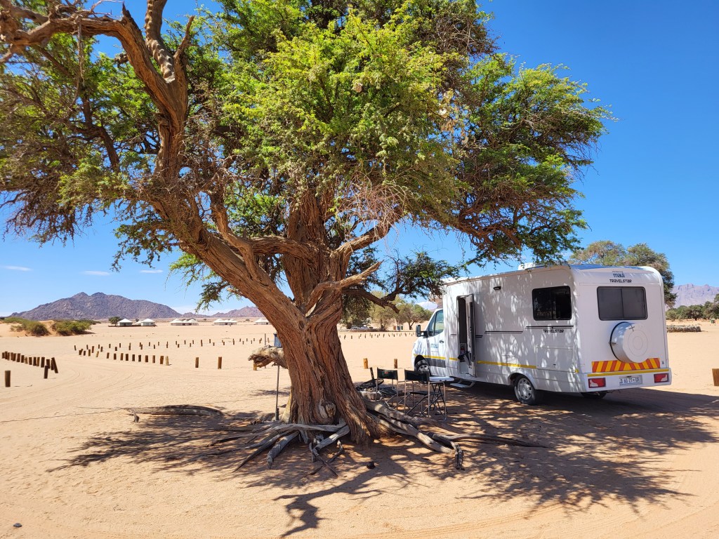 In Sesriem angekommen stehen wir zwar unter einem Baum, aber dennoch in der Sonne. Strom für die Klimaanlage gibt es leider nicht, also ist Schwitzen angesagt. Der Platz ist sehr sandig, großzügig angelegt. Das Camp heißt Dead Valley, der Name ist Programm.
