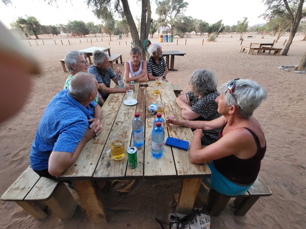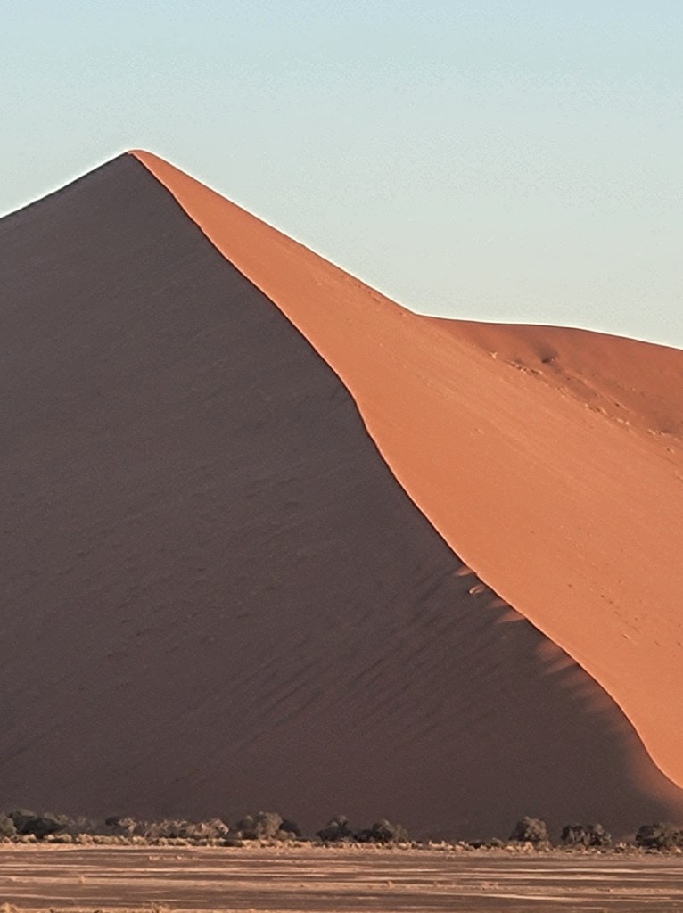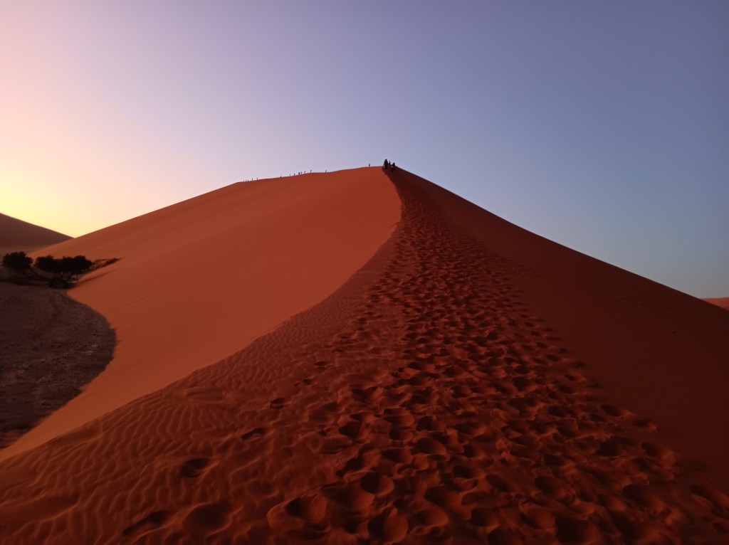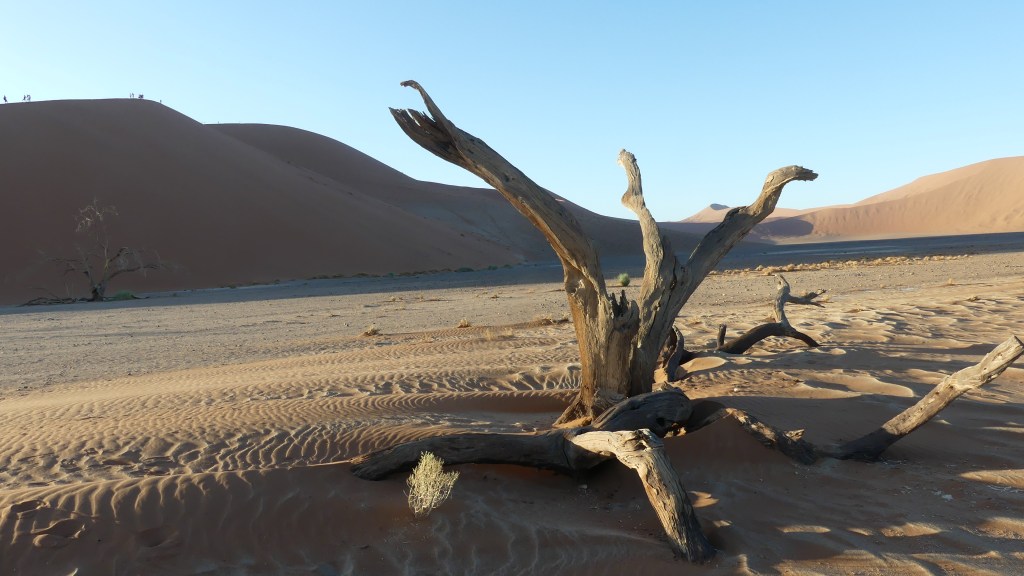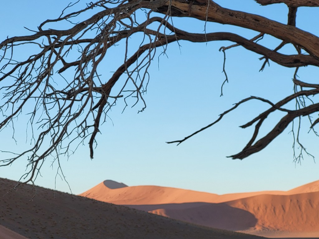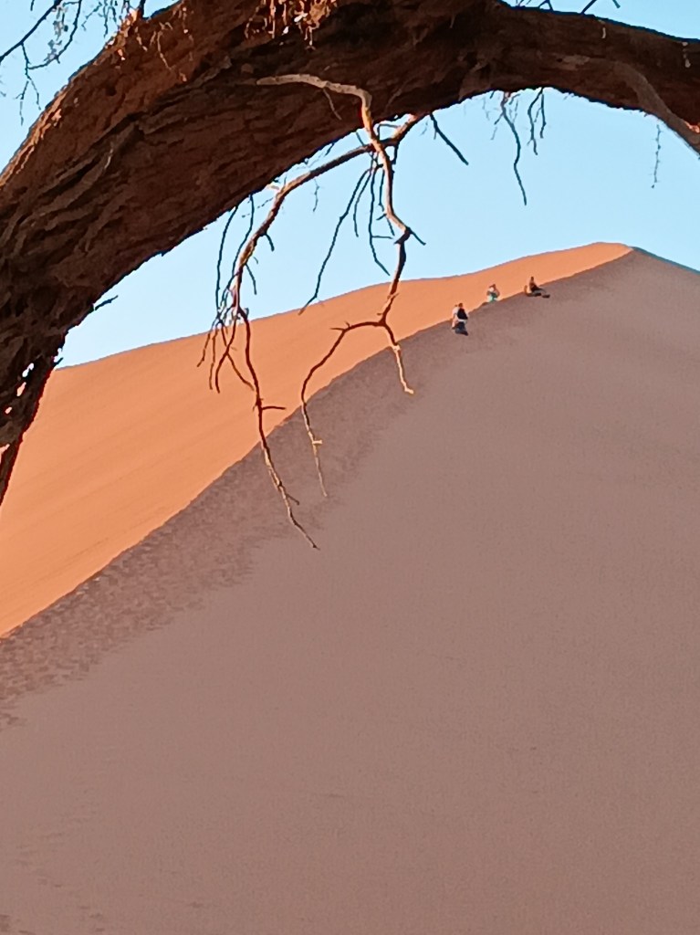 Frühes Aufstehen ist angesagt, denn wir wollen zur Düne 45 und den Sonnenaufgang erleben. Vom Camp aus sind es 45 km zur Düne und zum Dead Valley. Hoch zur Düne schaffen es nicht alle, jedoch auch von unten beobachtet ist es ein grandioses Naturschauspiel mit ganz besonderen Farben. Der rote Sand beginnt zu leuchten, phantastisch!