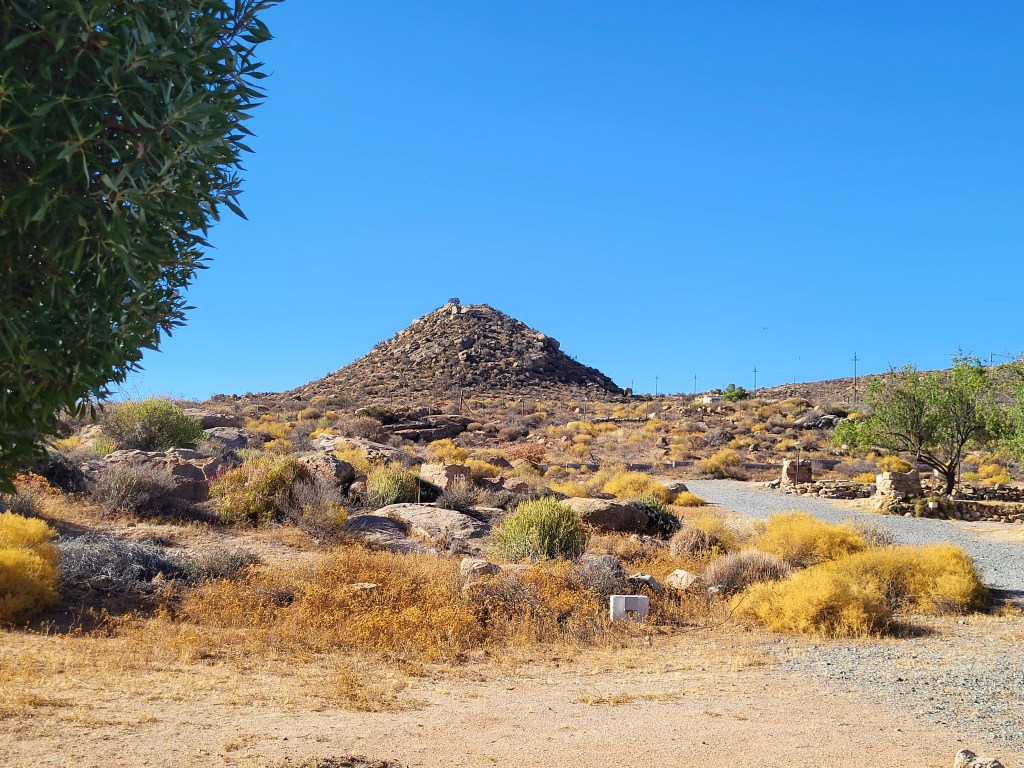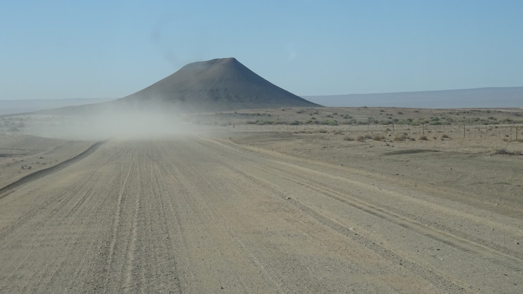 Staubpiste begleitet uns auf dem Weg nach Springbok. Zunächst biegen wir Richtung Ai Ais ab und dann suchen wir unseren eigenen Weg, der eine Abkürzung von 30 km bedeutet. Die Gegend ist trostlos, nur Steine. Aufgehäuft als ob ein Riesenbagger die Steinhaufen einfach abgekippt hätte. Riesige Steine, hohe Berge und sonst nur kilometerlange Staubfahnen. Trostlos, trist und langweilig.