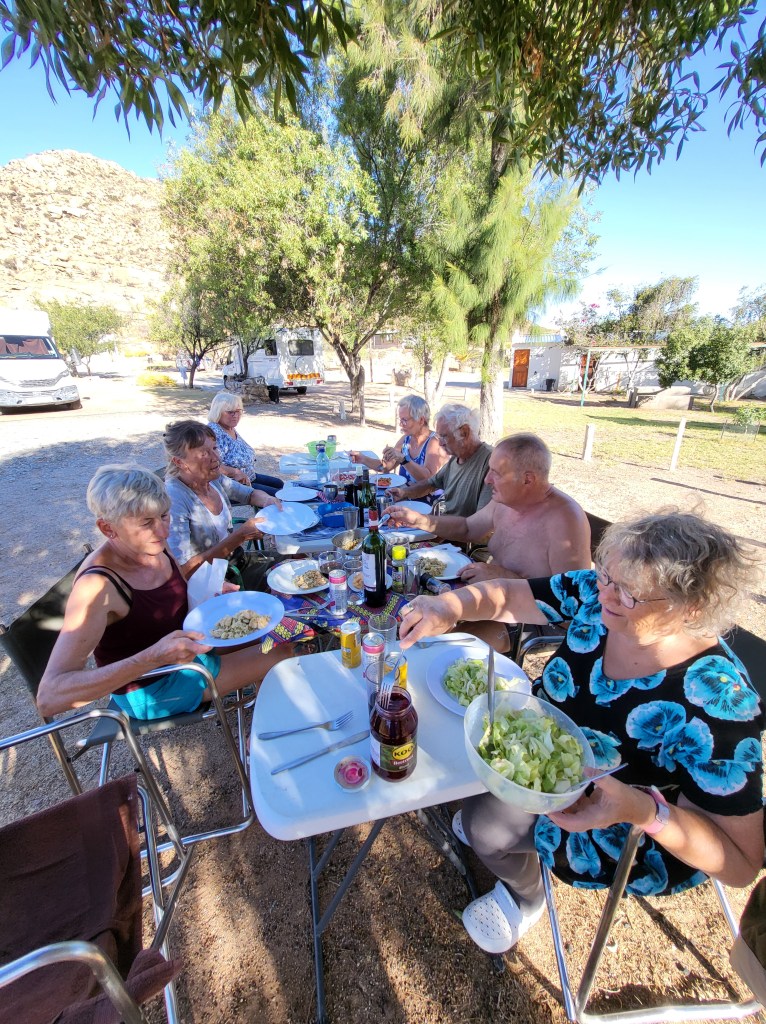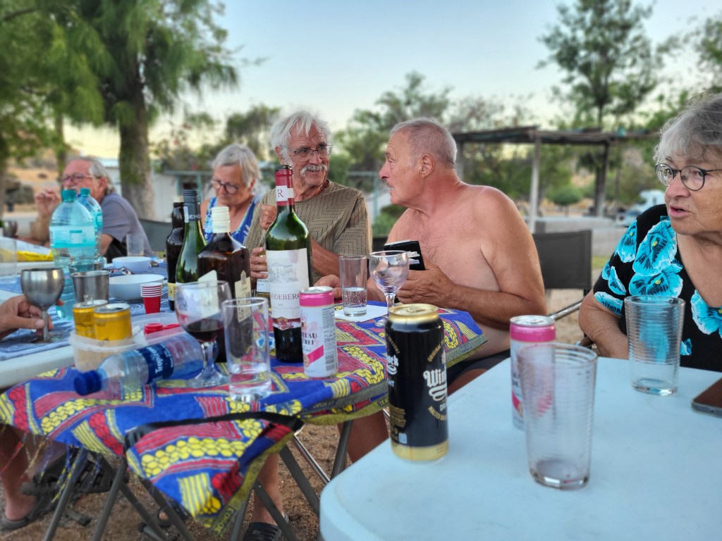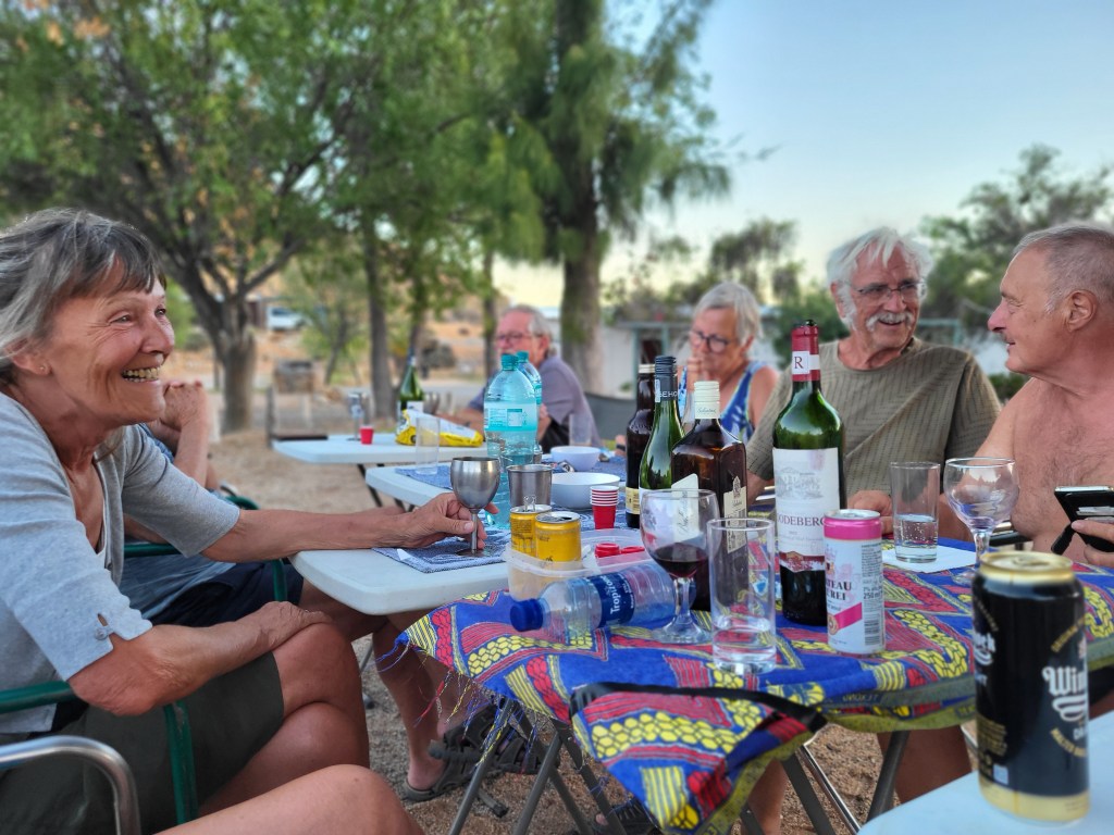 In Springbok ist der Campingplatz mit wenig Schatten. Dies mindert keinesfalls unsere gute Laune. Wir sitzen am Abend in der langen Reihe und verzehren leckere Zubereitungen aus den Resten, die jeder noch im Vorrat rumfährt. Und die alkoholischen Restbestände müssen ebenfalls noch „entsorgt“ werden.