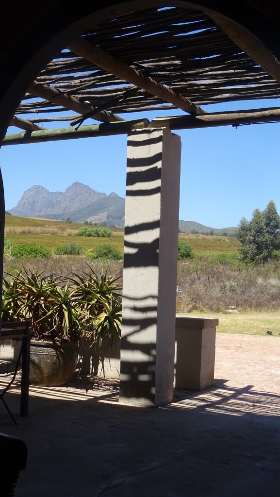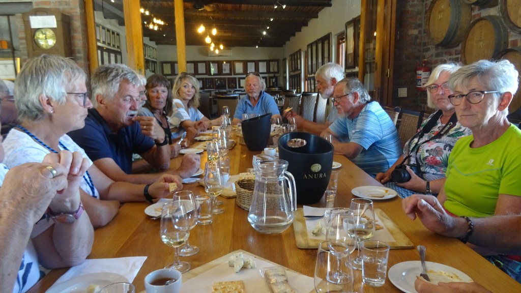Nicht schwächeln, wir sind um 12 Uhr schon bei der nächsten Weinprobe! Hier ist der Einfluß der französichen Hugenotten spürbar, es gibt leckersten Käse dazu. Camenbert, Burenkäse,schmeckt wie Schweizer Gruyere, ein Schnittlauchkäse und einen Ziegenkäse. Durch fünf Sorten Käse und Wein probieren wir uns und sind froh, dass es auch Wasser dazu gibt.