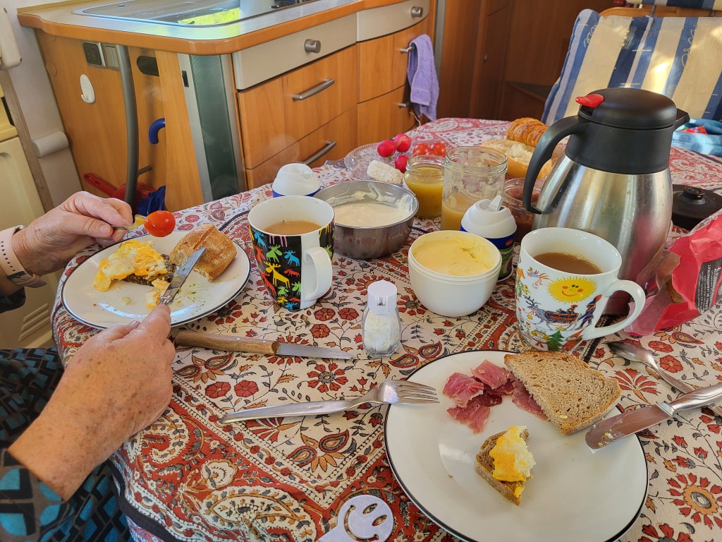 Groß ist die Enttäuschung, als wir feststellen müssen, dass heute gar kein Markttag ist, sondern morgen in Verbindung mit einem Antikmarkt. Wir stärken uns mit einem Petit Dejeuner mit Café au Lait und Croissant für den Rückweg.