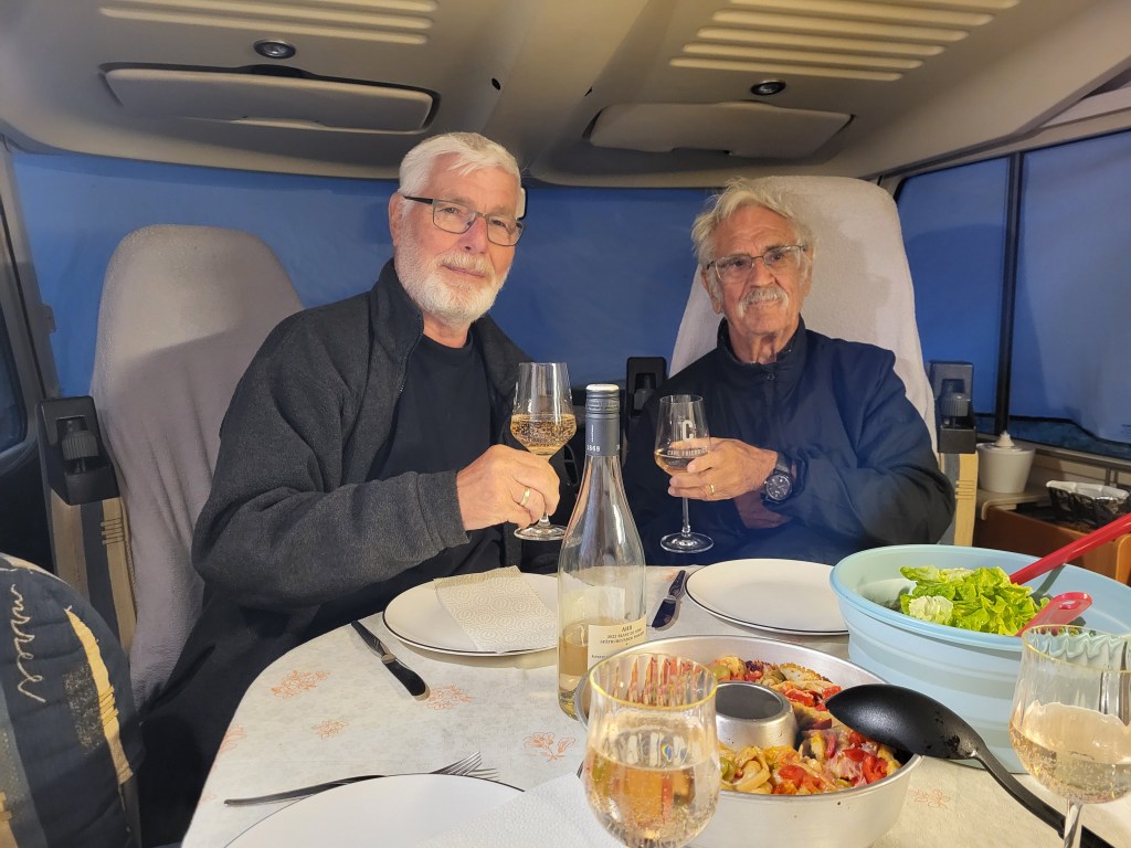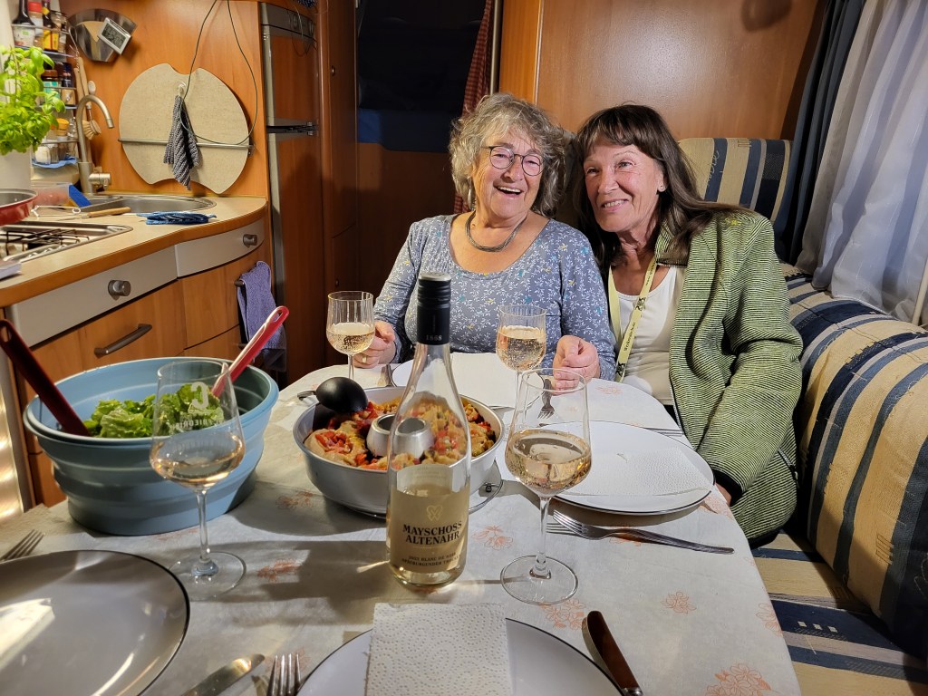 Wieder zurück gibt es Pizza aus dem OmniaOfen und Salat und leckeren Wein von der Ahr. Es weht ein kalter Wind und wir genießen die Wärme im Womo bei intensivem Gespräch über die Welt, die Politik und die Kriege, die uns Sorgen bereiten. Durchaus kontrovers diskutieren wir die Weltlage und unsere Gefühle und Meinungen dazu.
