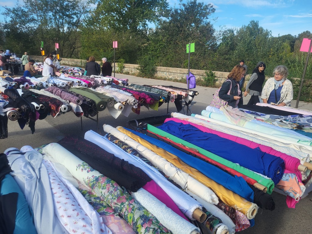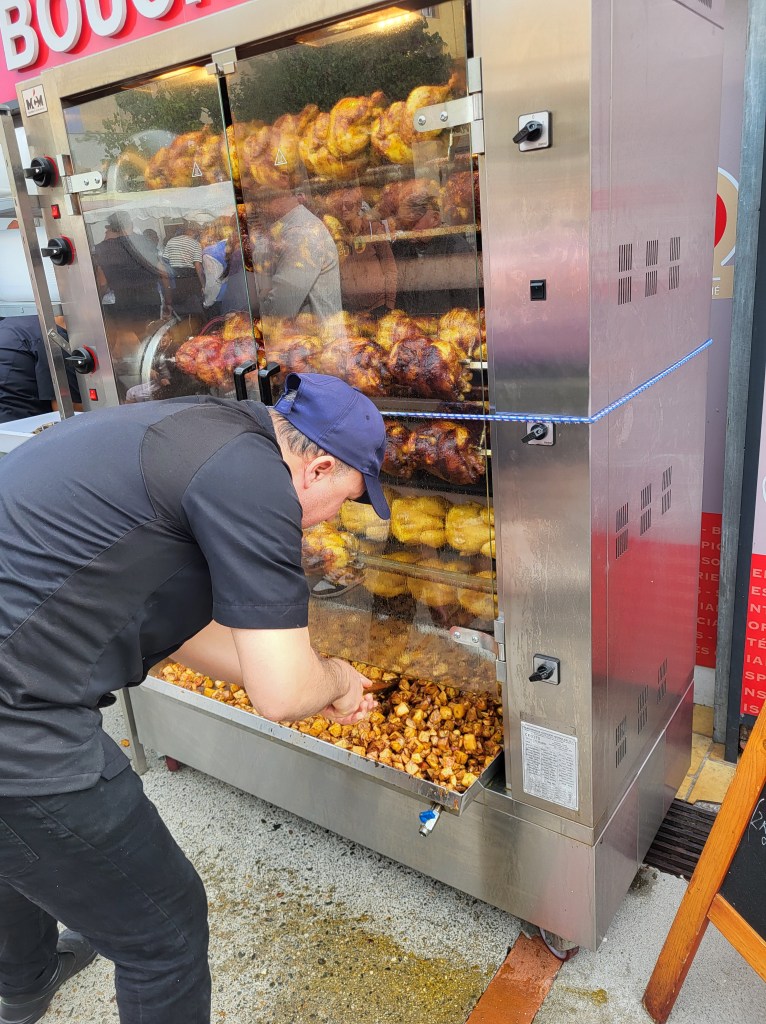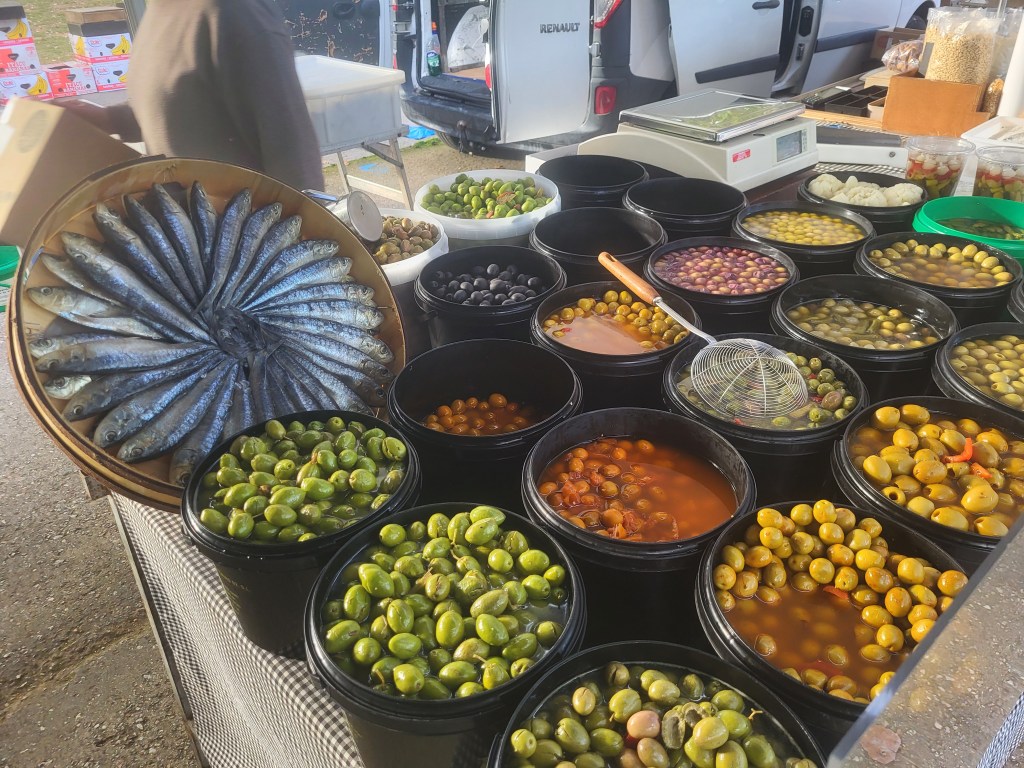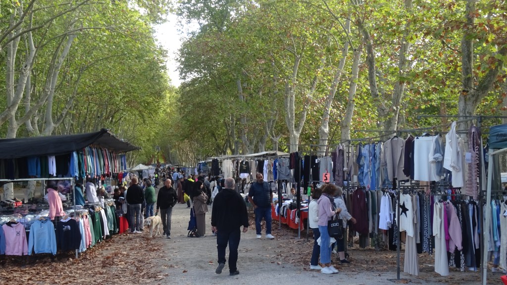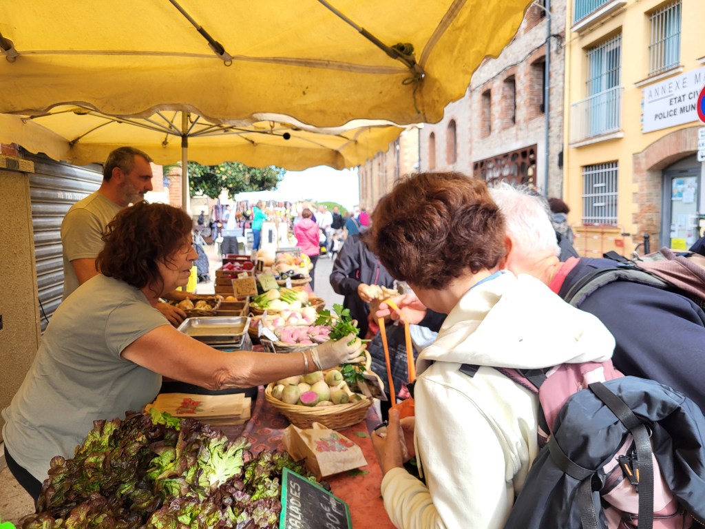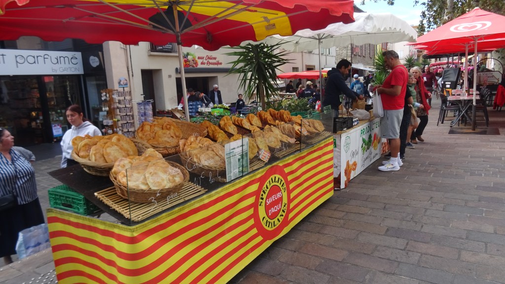 Dafür ist heute Markt in Argeles sur Mer!! Also zurück über die Steilstrecke zum Centre Ville Argeles. Ein kleiner Wochenmarkt entschädigt uns ein wenig. Es gibt sogar vegetarische Paella und gegrillte Hähnchen, so daß für alle das Abendessen gesichert ist.