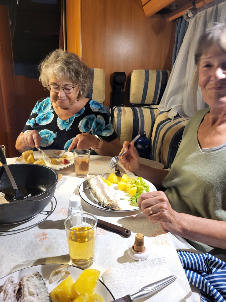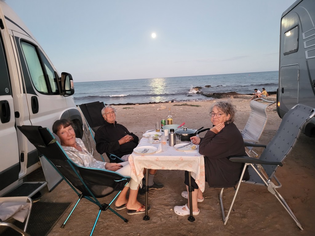 Eigentlich wollen wir den Nachmittag am Strand verbringen, aber der doch recht heftige Wind ist kühl und die Sonne lacht zwar freundlich, wärmt aber nicht so gut. So setzen wir uns ins Womo, chillen ein wenig und die Männer schauen Sportschau. Unser Abendessen ist schnell bereitet da wir noch genug Paella haben.