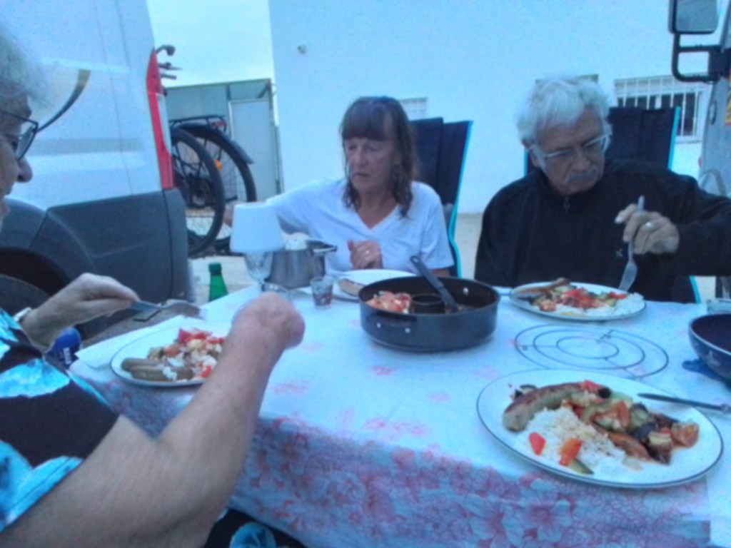 Am Abend spazieren wir am Strand entlang zu den Hochhäusern und bekommen ein erstklassiges Abendessen. Kaninchen mussten dran glauben, auch Rindfleisch und Gemüse! Es war echt lecker, Manfred hat seit vielen Jahren mal wieder Karnickel gegessen. Zum Nachtisch gibt es den Kuchenrest mit Joghurt und Sahne, lecker!