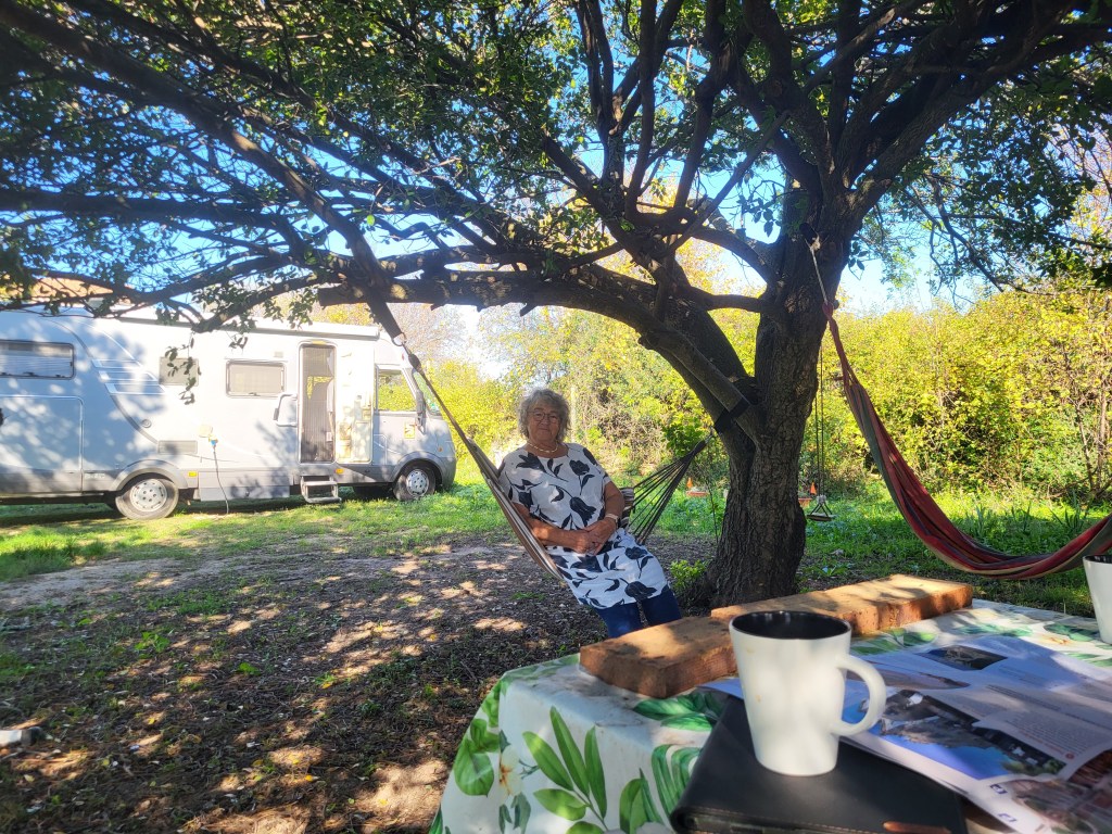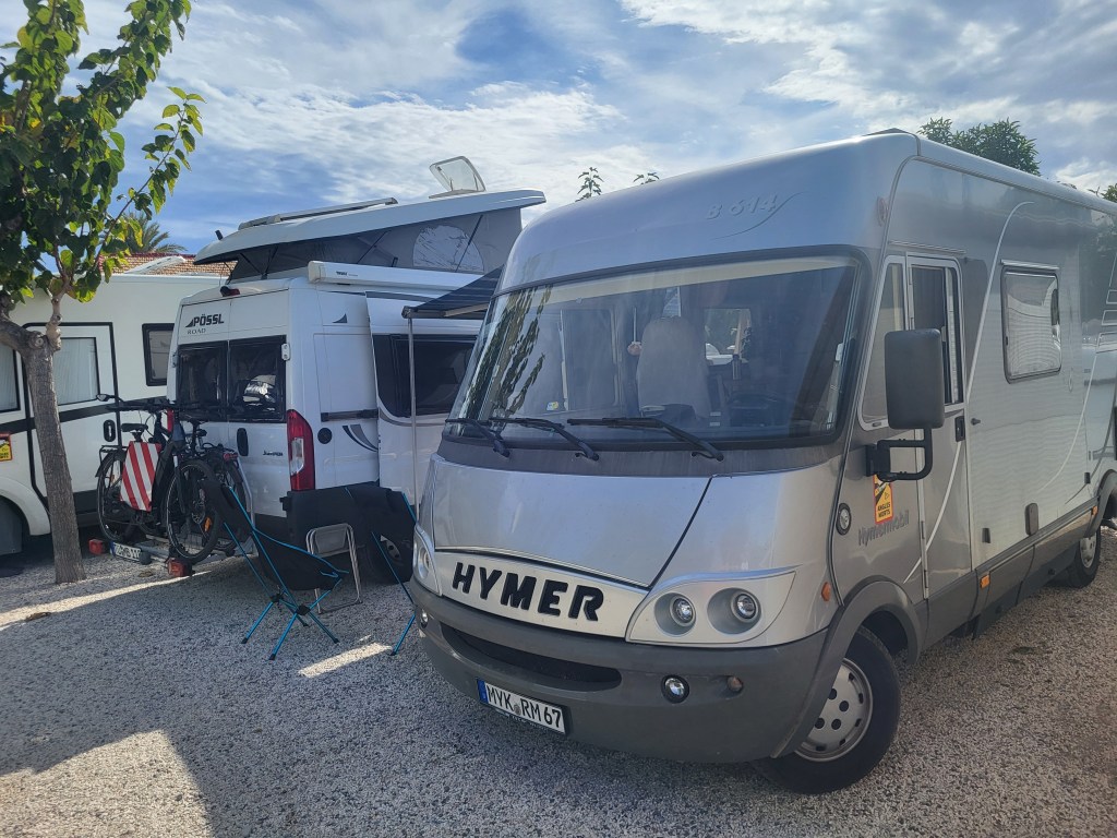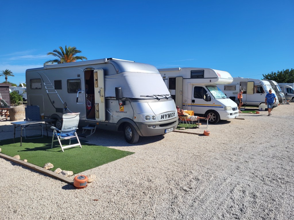Wir brauchen Wasser, müssen entsorgen und buchen einen Platz auf dem Komfort-Stellplatz La Marina, der von Niederländern betrieben wird und sehr gepflegt ist. 13 €/Nacht, Strom extra ist angemessen. Der Platz ist voll, wir müssen bis 12 Uhr warten, dann dürfen wir einparken und die Stühle in die Sonne stellen! Erstmal alles an die Steckdose, was nach Ladung schreit. Wir richten uns ein, putzen und räumen, lesen und faulenzen,