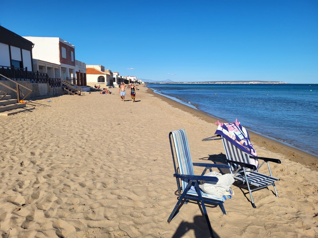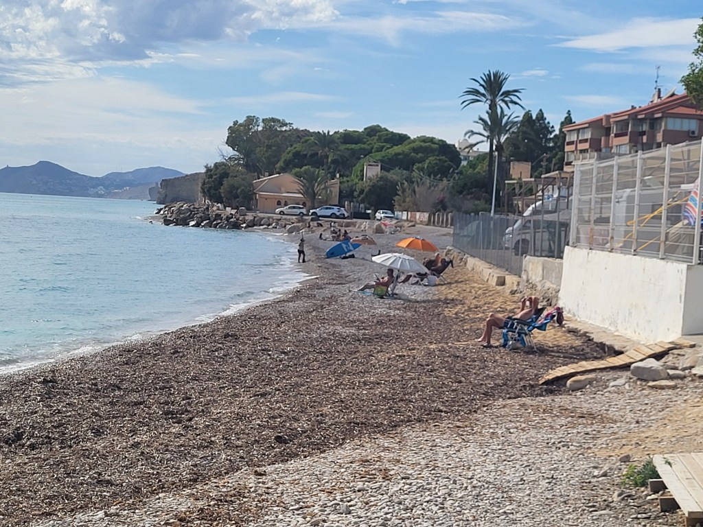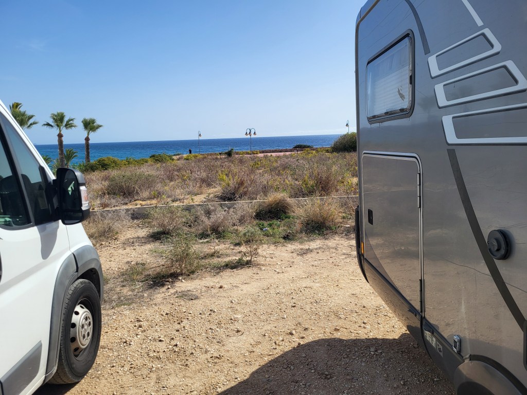 Nicht weit weg von Alicante finden wir nach ausgiebigem Einkauf samt Kühlbox (ohne 12-Volt-Anschluß) den angepeilten Park4night-Stellplatz. In der ersten Reihe zu stehen ist schön, jedoch ist dieser Strandabschnitt steinig und daher nur wenige Womos hier. Gut und ruhig! Wir ahnen den Grund, denn links befindet sich der Hundestrand und ein eingezäuntes Areal, wo die Haufen abgelegt werden können.
