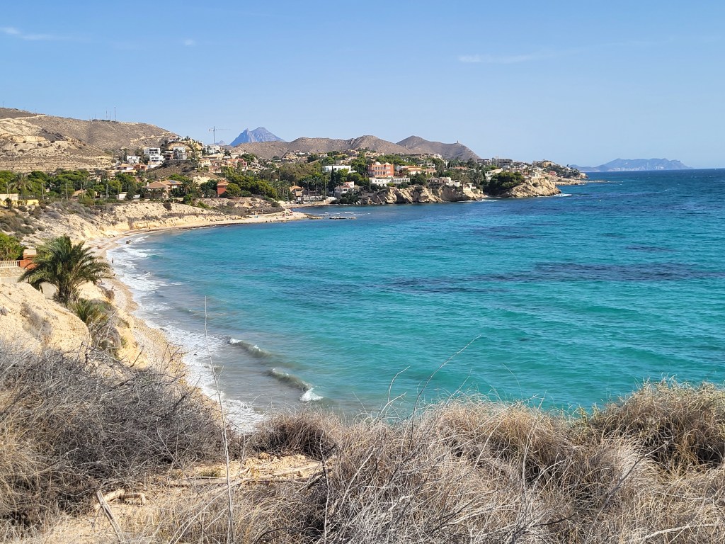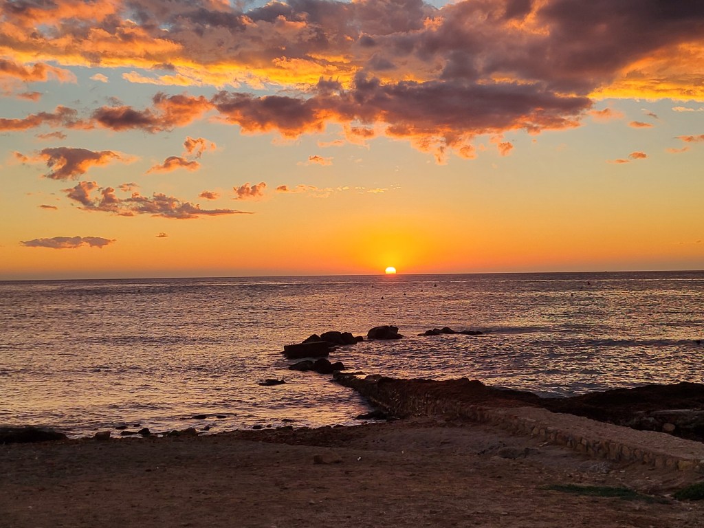 Wir finden in der Nähe von Alicante einen (Park-)platz direkt am Meer. Es ist keine offizielle Zufahrt vorhanden, aber ein Womo steht schon dort. Also richten wir uns mit Meerblick ein für zwei oder drei Nächte. Es gibt keinen Strand, nur einen Spazierweg steil bergab. Dennoch ist die Stimmung schön, Meeresrauschen, wunderbarer Sonnenuntergang, Herz was willst du? Meer;))