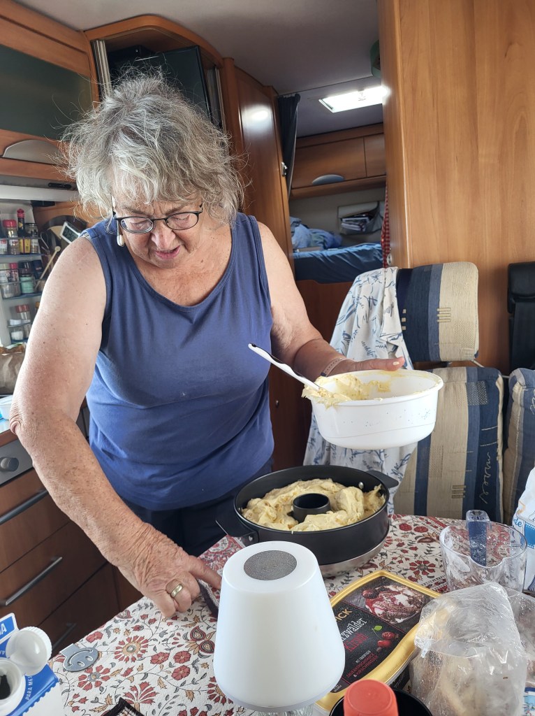 Ein Ruhetag! Wir brökeln rum, lesen und so, nix Besonderes. Martina will den Umgang dem Omnia-Gerät üben und so backen wir einen Rührkuchen. Leider ist der Start etwas holprig, denn die Form war ohne den Untersatz auf dem Gas gelandet. So riecht es gleich sehr angebrannt. Leider wirkt sich der Brandgeschmack auf den ganzen Kuchen aus und wir müssen großzügig abschneiden. Dennoch: der Kuchen an sich ist gelungen, locker, gut aufgegangen, echt perfekt. Dass er Martinas Geschmack nicht trifft liegt an der Art des Kuchens. Ich glaube, dass Martina zukünftig eher Hefeschnecken mit Zimt oder Pizza zubereitet;).