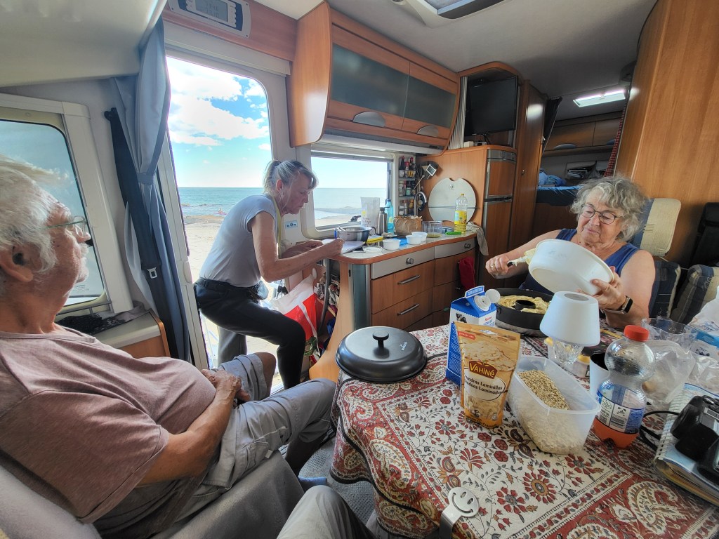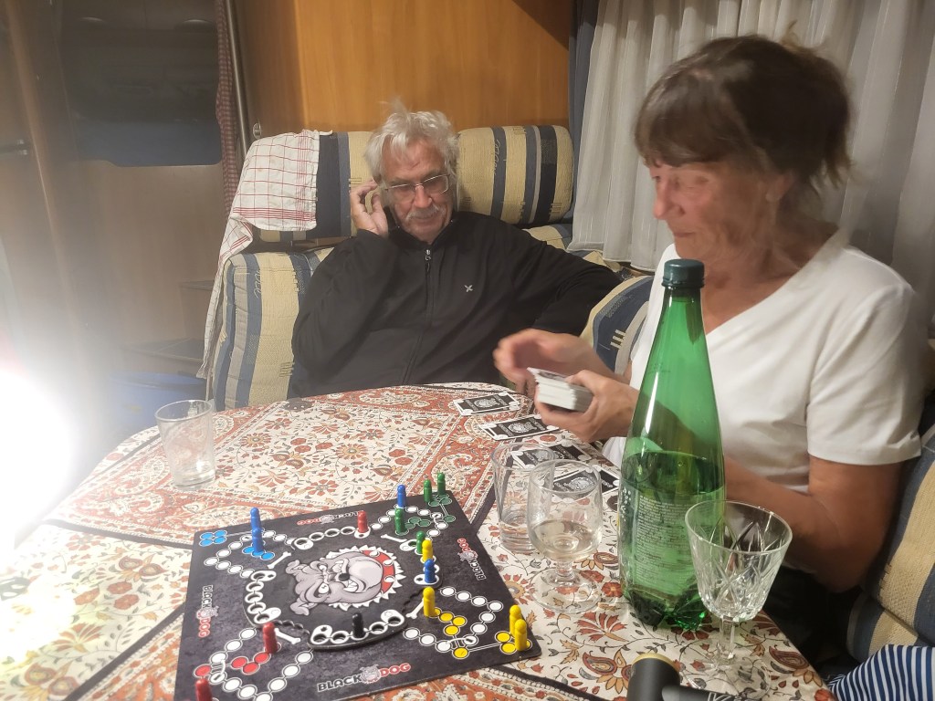 Wir kommen nach mehr als 1000 km Fahrt ca 15 Uhr in Argeles sur Mer auf dem Campingplatz Roussiallance an und werden freudig begrüßt von Martina und Bernd. Zum Willkommen gibt es einen Aperol mit Sekt und ein leckeres Abendessen. Wir sitzen draußen und genießen den Abend mit den Freunden. Wir spielen Sieweström, Manfreds Lieblingsspiel, welches alle Freunde lernen müssen;))