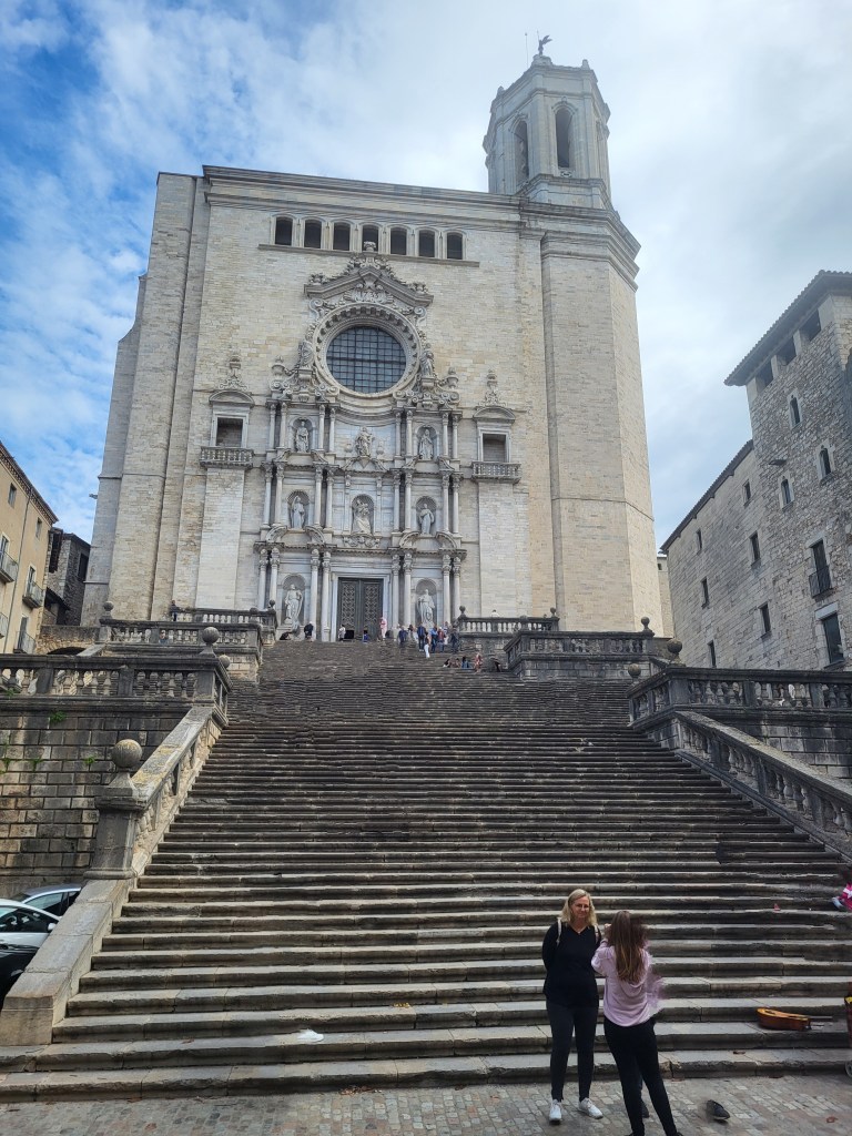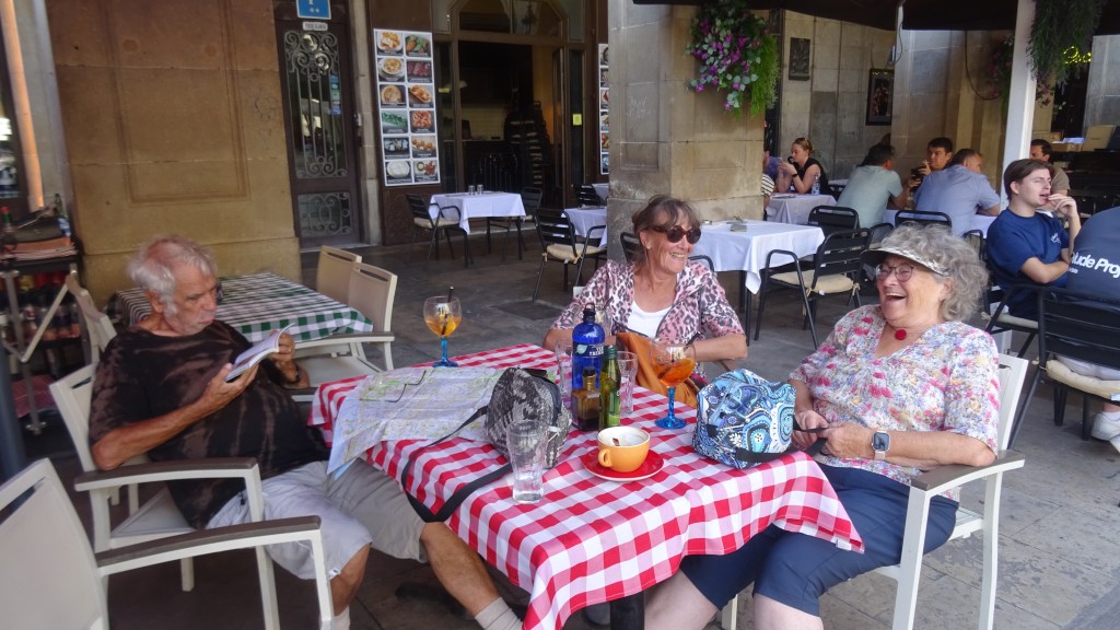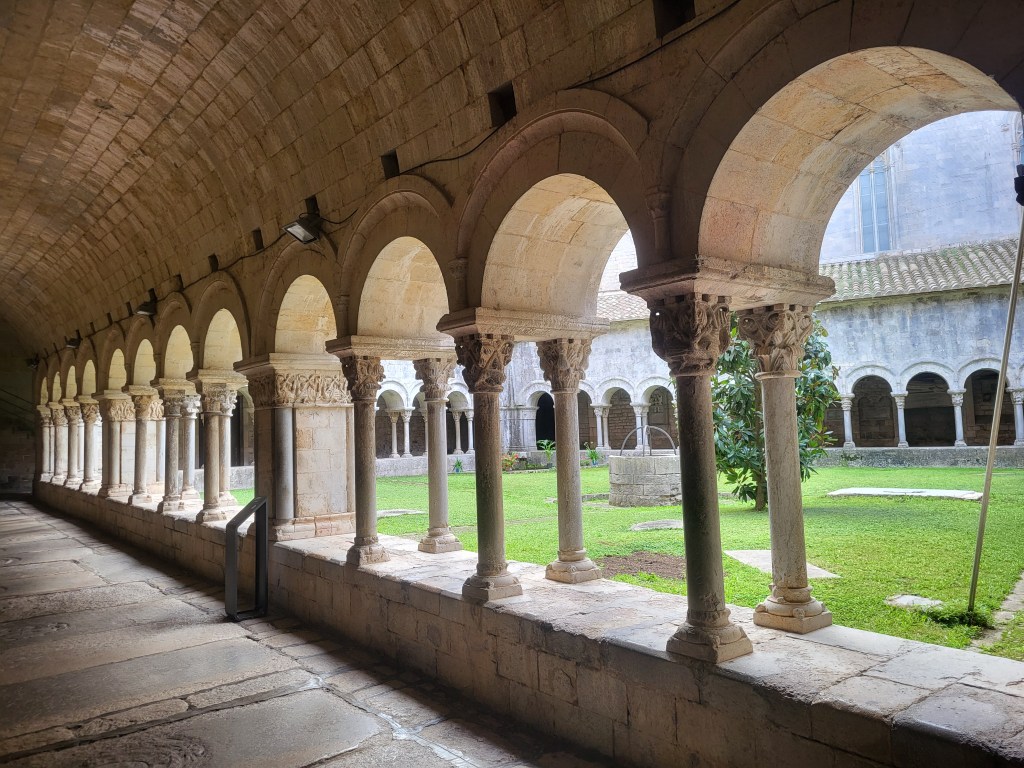 Höchste Zeit, mit der Stadtbesichtigung zu beginnen. Zwei Kirchtürme grüßen von weitem, die Basilika Sankt Felix und die Kathedrale. In St. Felix sind bemerkenswert viele Sarkophage in den Seitenaltären untergebracht. Viele Treppen im Barockstil führen hinauf zur Kathedrale;( Das breiteste Kirchenschiff weltweit wird etwas geteilt durch die Orgel, die in der Mitte steht. Goldene Seitenaltäre sind zu bewundern. Ein wunderbarer Kreuzgang lädt zum Verweilen. Wir bummeln durch die malerische Altstadt, stärken uns mit Tapas und radeln wieder zum Womo.