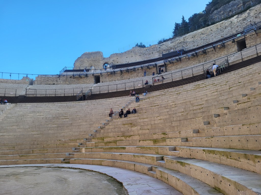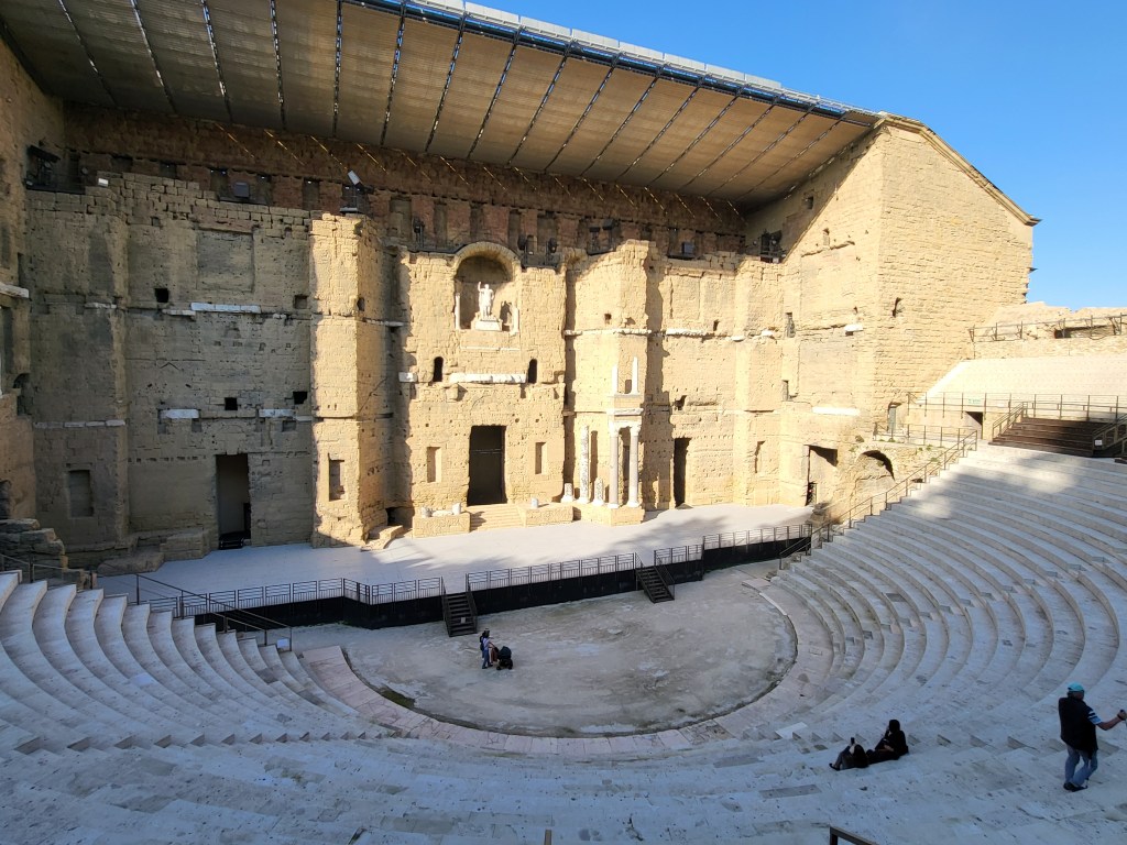 Wir erreichen Orange, unser heutiges Etappenziel. Hier waren die Römer aktiv, es gibt ein riesiges Theater, das besterhaltendste nördlich der Alpen;). Es wird heute noch für Aufführungen genutzt. Und der Gang durch den Arc de Triumphe darf nicht fehlen.Auf dem privaten Stellplatz Air de Stationnement Particular finden wir ein schönes Plätzchen mit Hängematten, Spielplatz und einem netten Herrn, der uns gleich (teuren) Wein anbietet. Die „Wohnmobilruhestätte“ ist tatsächlich sehr ruhig;)