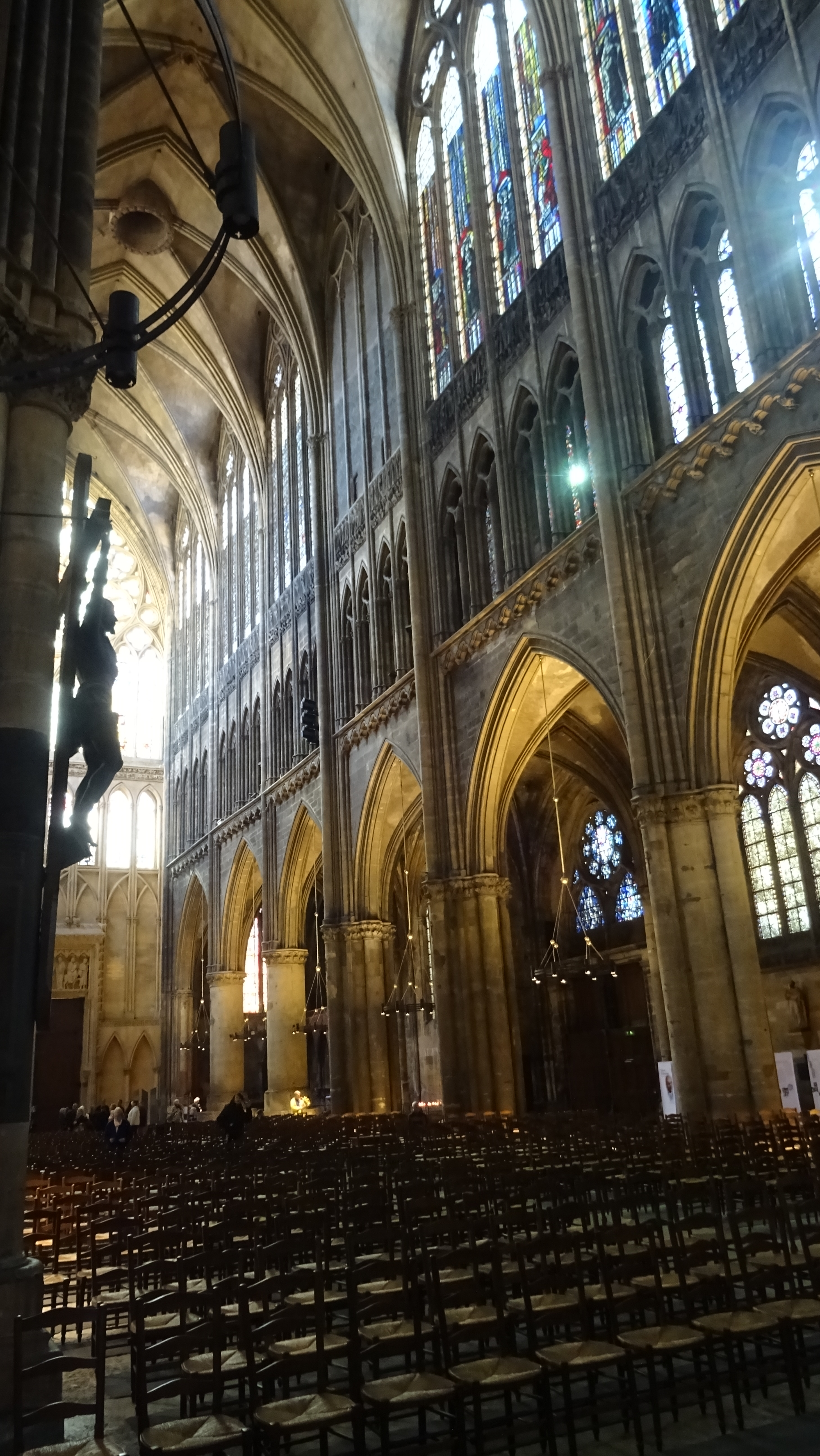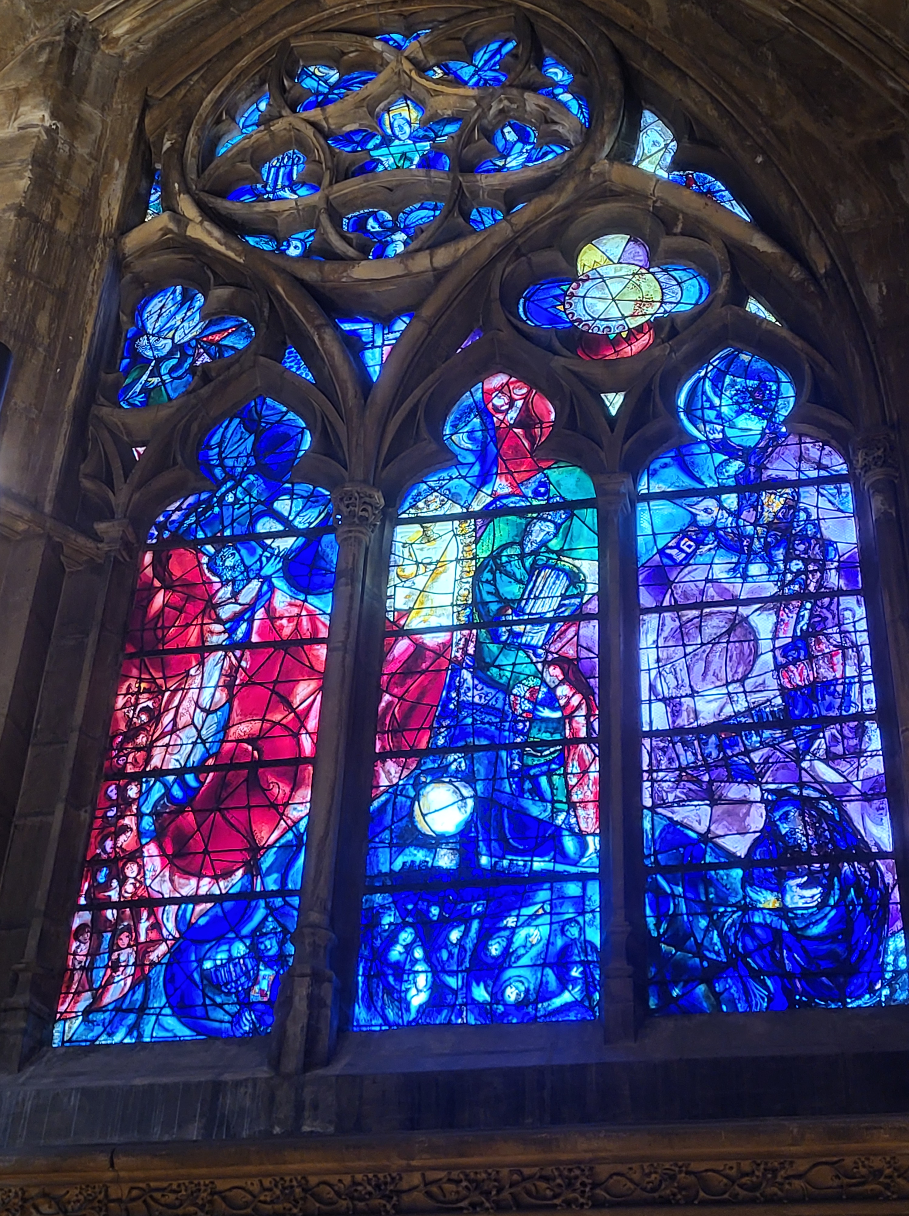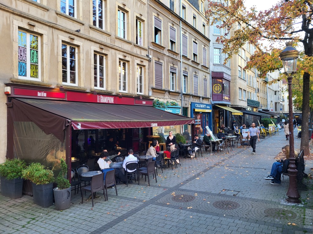 Wir kommen nach Metz und finden auch nach einem kleinen Umweg den Stellplatz an der Mosel. Mit den Rädern erkunden wir den alten Teil der Stadt und gelangen zur Kathedrale. sie gilt als eine der schönsten und größten gotischen Kirchengebäude Frankreichs. Die Sonne steht günstig und lässt die wunderbaren Fenster im Licht erstrahlen. Besonders beeindruckend sind die Glasfenster, die von Marc Chagall entworfen worden sind. Ein Drache schnaubt Gott sei Dank kein Feuer – warum er einen Platz hier gefunden hat, erschließt sich uns nicht. (Nachgelesen bei wiki: Der Drache hauste in den Ruinen des röm. Amphitheaters und wurde vom Hl Clemens, dem ersten Bischof von Metz im 3. Jahrhundert vertrieben. bis ins 19. Jahrhundert gab es jährlich Drachenumzüge)