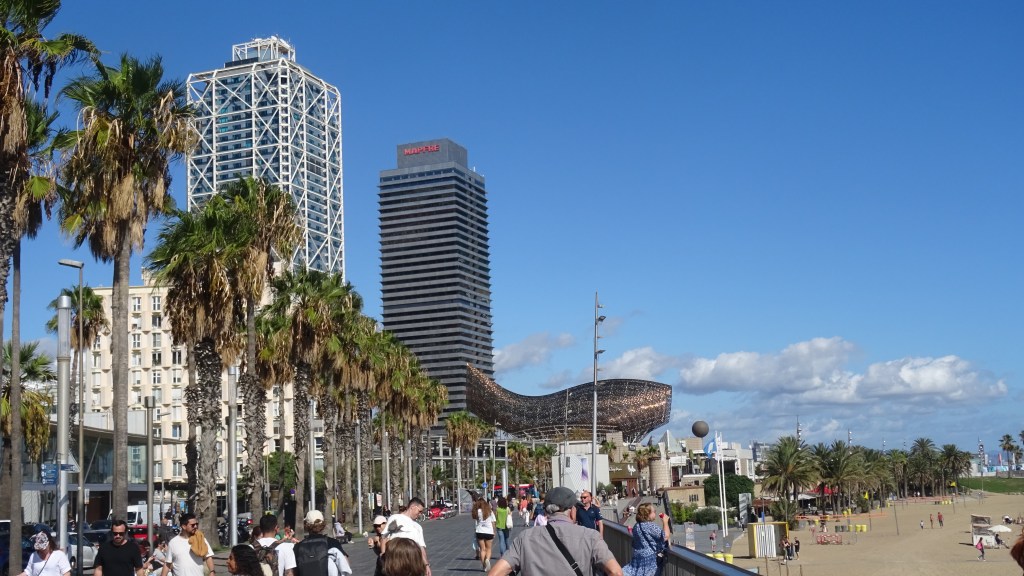 Eine Miniradtour am Strand entlang bis zum silbernen Fisch, welcher sozusagen als Nebenprodukt für die Olympiade entstanden ist. Viele interntionale Architekten waren gefragt für einen spektakulären Entwurf. Und der nicht gefragte Stararchitekt Geery hat den Fisch entworfen, der nunmehr zum Wahrzeichen der Stadt geworden ist. Zurück schlendern wir durch den alten Stadtteil Barcelonetta auf der Suche nach Tapas.