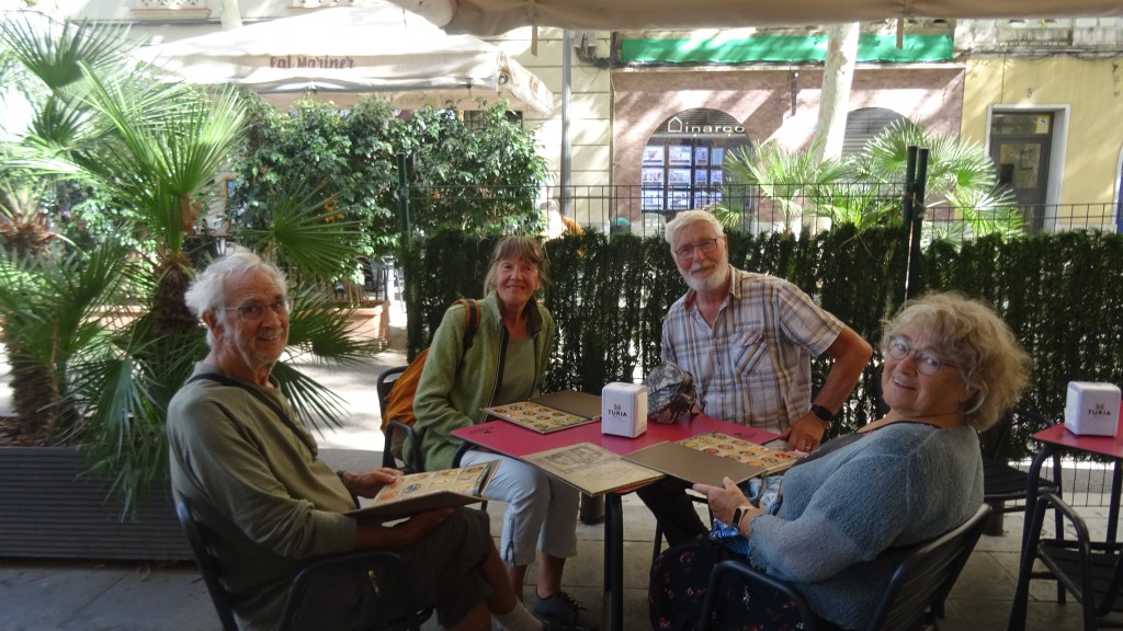 Als Übernachtungsplatz haben wir uns einen Stellplatz bei einer sog. Bodega ausgesucht. Dieser liegt inmitten von Orangenhainen. Der Weg dorthin ist ein rechtes Abenteuer. Das Navi führt uns in eine schmale Straße, relativ unbefestigt. Das angepeilte Haus ist verschlossen und nur Hunde regen sich über unsere Ankunft auf. Was tun? Manfred vertraut dem Navi und fährt weiter in die Obstplantage hinein. Seeeehr schmaler Weg, an den Seiten jeweils ein tiefer Graben, sehr scharfkantig angelegt, so dass ein Ausrutscher abwärts einen Totalschaden verursachen würde. Ohje, auch Wenden wird zum Lotteriespiel, weil für unser großes Womo einfach nicht genug Platz ist. Manfred weiß sich keinen anderen Rat, als zwischen die Reihen der Orangenbäume zu fahren. Dabei brechen Äste ab und das Womo bekommt neben dekorativen Streifen an den Seiten auch am Heck einiges ab. Vorsichtig fahren wir wieder raus auf die nächste befestigte Straße und Martina gibt den entscheidenden Hinweis für den richtigen Weg. Natürlich ist der Stellplatz ausgebucht. Ein holländisches Paar hat sich hier vor ca. drei Monaten niedergelassen und der Stellplatz gilt nur als Parkplatz für die Gäste der Weinproben und Tapasabende. Wir dürfen uns im Hof für die Nacht einquartieren. Die Weinprobe ist ausgebucht, aber wir kaufen einfach ein paar Flaschen des teuren Edelweines. Wegen dem Stress haben wir keine Fotos gemacht. Erst am Abend beim Essen wurde ein Foto gemacht.